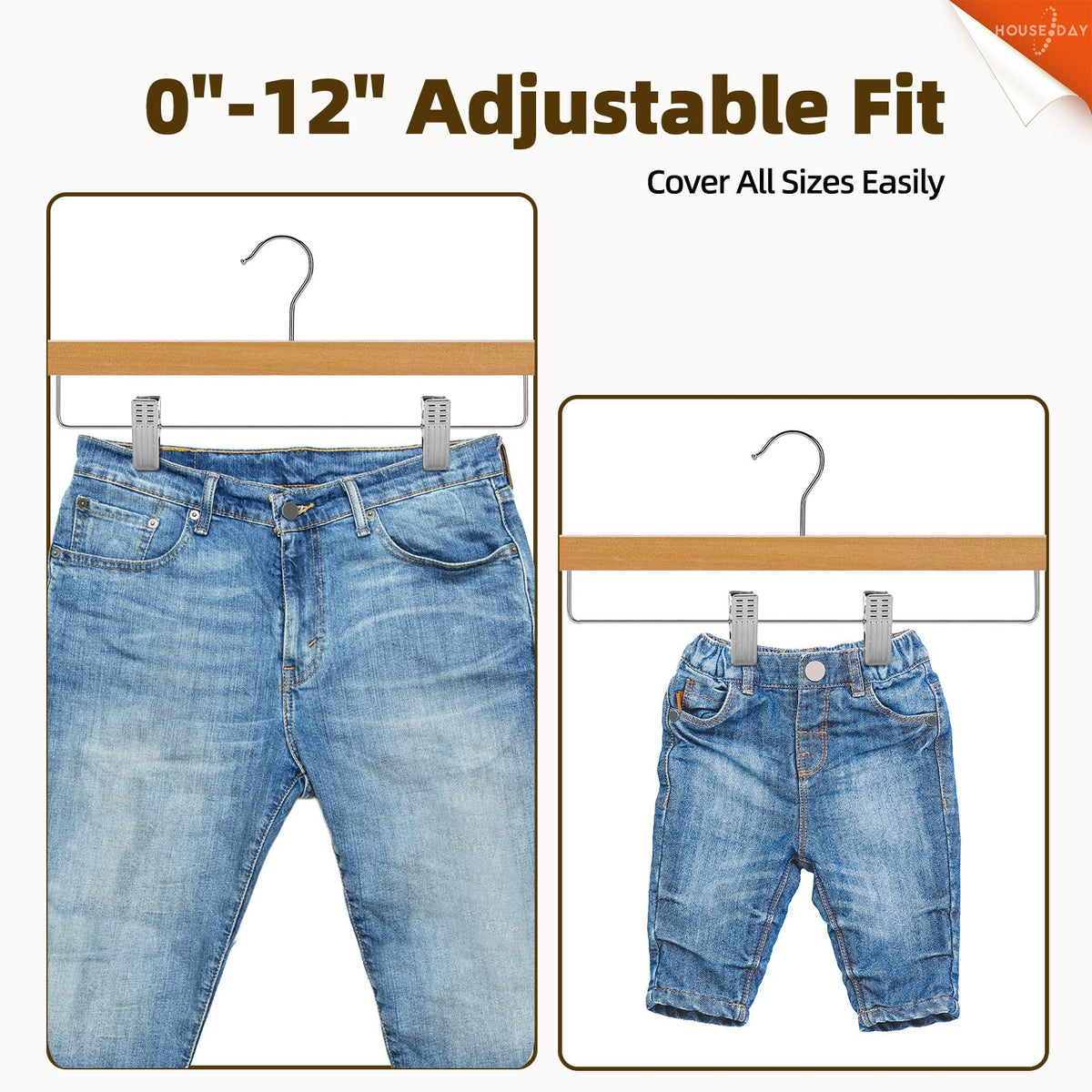 Q: Can the clips on these hangers accommodate different clothing sizes?A: Yes, the wooden pants hangers feature adjustable clips that can be easily moved to fit various clothing sizes. This makes them suitable for both adult and children's clothes, allowing you to securely hang skirts, trousers, and shorts without any hassle.