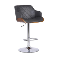 Mixed materials and timeless style come together with Toby Gray Faux Leather Adjustable Height Swivel Walnut Wood and Chrome Bar Stool from Armen Living. Find comfort at any surface with the adjustable seat lever that allows you to pull the Toby up to your kitchen island, peninsula counter, or home bar. This kitchen stool features soft faux leather upholstery that looks beautiful and makes for easy clean up when spills occur. The seat back features a diamond stich pattern that only adds to the appeal of this stool and the wood accent under the seat adds a touch of contrast that really makes the Toby a stand-out piece of furniture. Enjoy the limitless mobility with the 360-degree swivel function that helps your guests stay engaged no matter their place in the room at parties or gatherings. The Toby adjustable stool is ideal for bar or counter height surfaces and is available in your choice of a chrome finish with black or gray faux leather upholstery and a walnut wood seat or a black metal finish with gray faux leather upholstery and a black wood seat.
