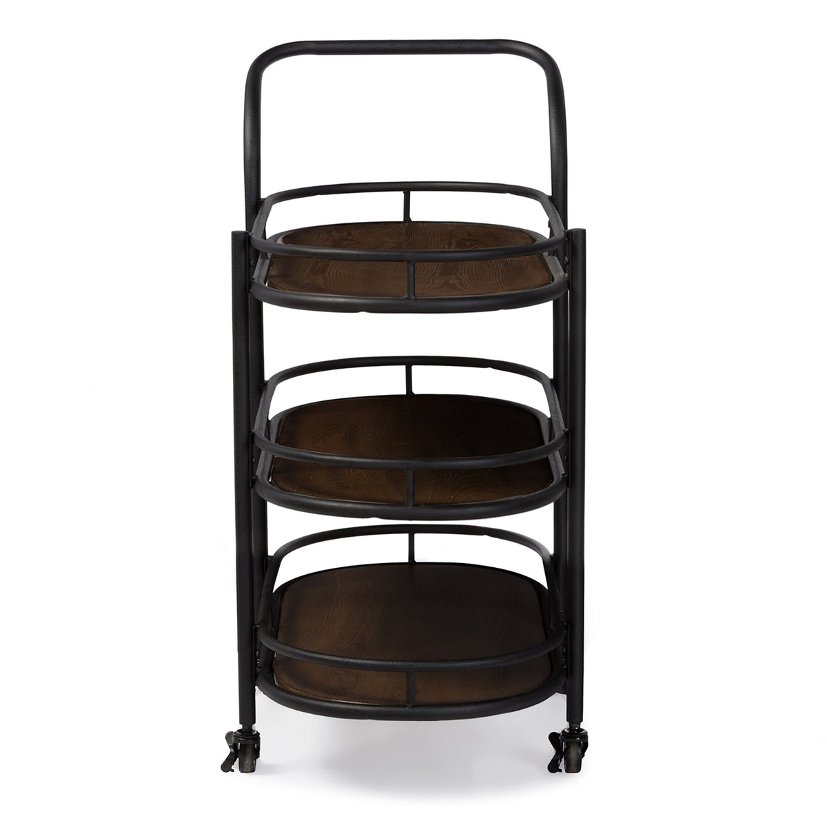 Rustic and industrial in design, this Karlin Rustic Industrial Style Antique Black Finishing Metal and Wood Mobile Kitchen Bar Serving Wine Cart adds the perfect amount of extra storage to small dining rooms, kitchens and other spaces. This rolling bar serving kitchen cart has a weathered and timeworn finishing. Constructed of sturdy metal frame in antiqued bronze finishing with MDF and distressed ash veneer, the Karlin features three spacious storage shelves for your wine bottles, glasses and kitchen utensils. The shelves are strengthened with the metal rails for your practical use. The caster wheels allow for easy mobility, in addition to the push handle. Made in China, the Karlin kitchen rolling cart requires assembly
