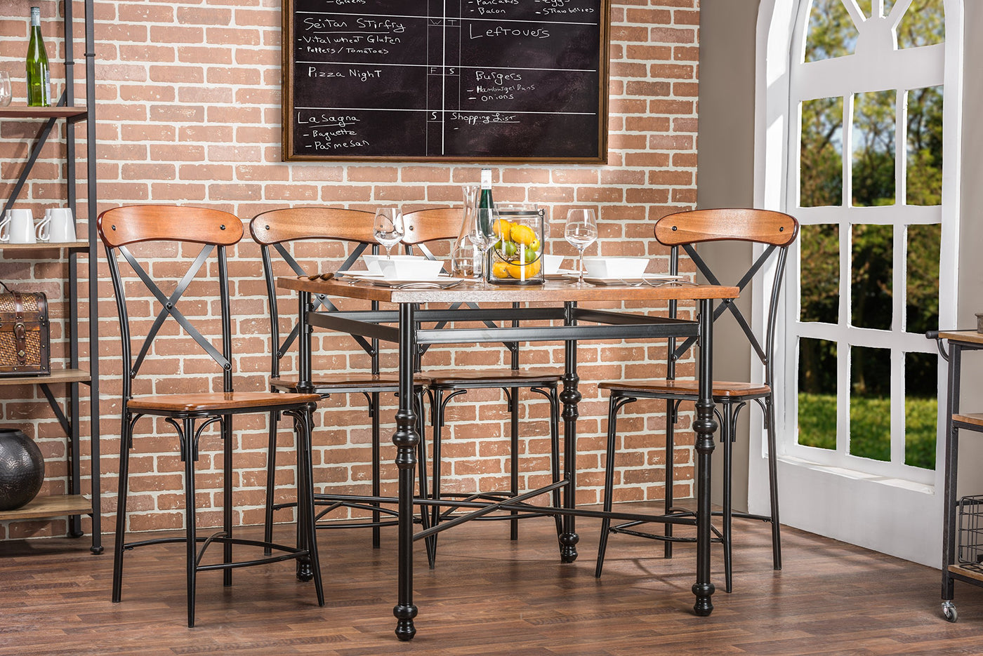 Rustic styling and contemporary flair join as one in our Broxburn Wood and Metal Pub Table. Antique black-finished metalwork and a distressed brown ash veneer wood top convey a vintage-industrial vibe. Sturdy construction ensures years of use.