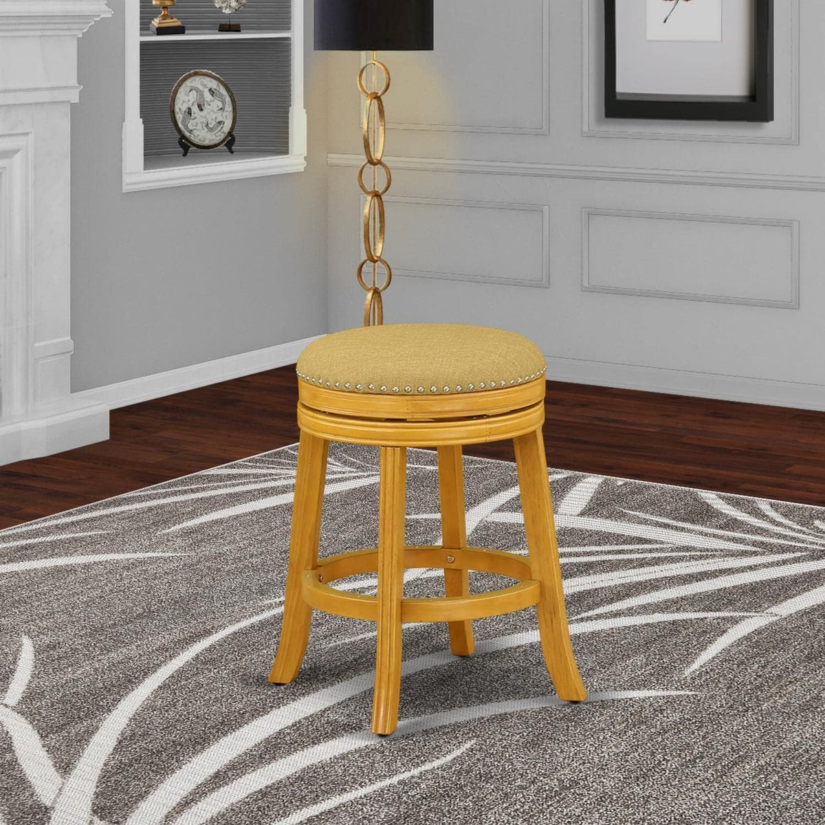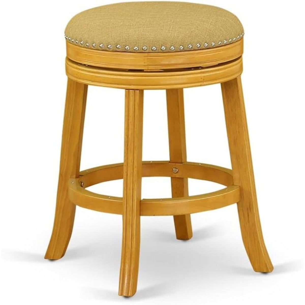 East West Furniture - Dvs024-416 - Devers Swivel Barstoolthis Refined Counter Height Stool Made Of Wood Is Guaranteed To Make An Elegant Statement In Your Home, Showcasing Impeccable Design. Finished In Oak, This High-Class Counter Height Stool Exhibits A Natural Vegas Gold Finish Upholstery Seat With High-Density Foam For Optimal Comfort. Its Backless Design Not Only Enhances Its Appearance In Dining Areas But Also Makes It An Ideal Choice For Pool Areas Or Game Rooms. The 360-Degree Swivel Seat Allows For Easy Maneuverability. The Solid Wood Frame Is Reinforced For Stability, While The Footrest, Protected By A Metal Kick Plate, Ensures Longevity And Durability. Moreover, The Inclusion Of Floor Glides Safeguards Your Floors And Facilitates Seamless Gliding. The Stool Is Further Adorned With Decorative Nail Trimming On The Seat And Elegantly Curved Legs. Combining Both Comfort And Exquisite Design, This Bar Stool Offers A Compelling Choice For Your Space.Feature: Material: Wood Legs Color: Oak Fabric Material: Pu Leather Fabric Color: Vegas Gold Dimension # Barstool: Length: 23; Width: 23; Height: 24.Include: A Beautiful Swivel Barstool.