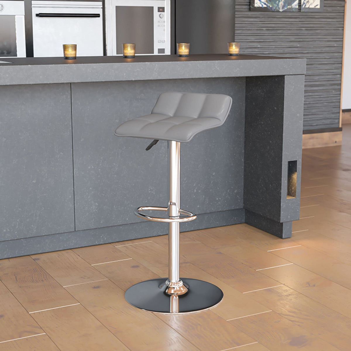 Simplicity And Elegance Go Hand In Hand With This Gray Adjustable Height Barstool With A Charming Quilted Design. The Overall Design Is Casual And Contemporary Which Allow It To Seamlessly Accent Any Area In The Home. The Easy To Clean Vinyl Upholstery Is Perfect When Being Used On A Regular Basis. The Height Adjustable Swivel Seat Adjusts From Counter To Bar Height With The Handle Located Below The Seat. The Chrome Footrest Supports Your Feet While Also Providing A Contemporary Chic Design. To Help Protect Your Floors, The Base Features An Embedded Plastic Ring.