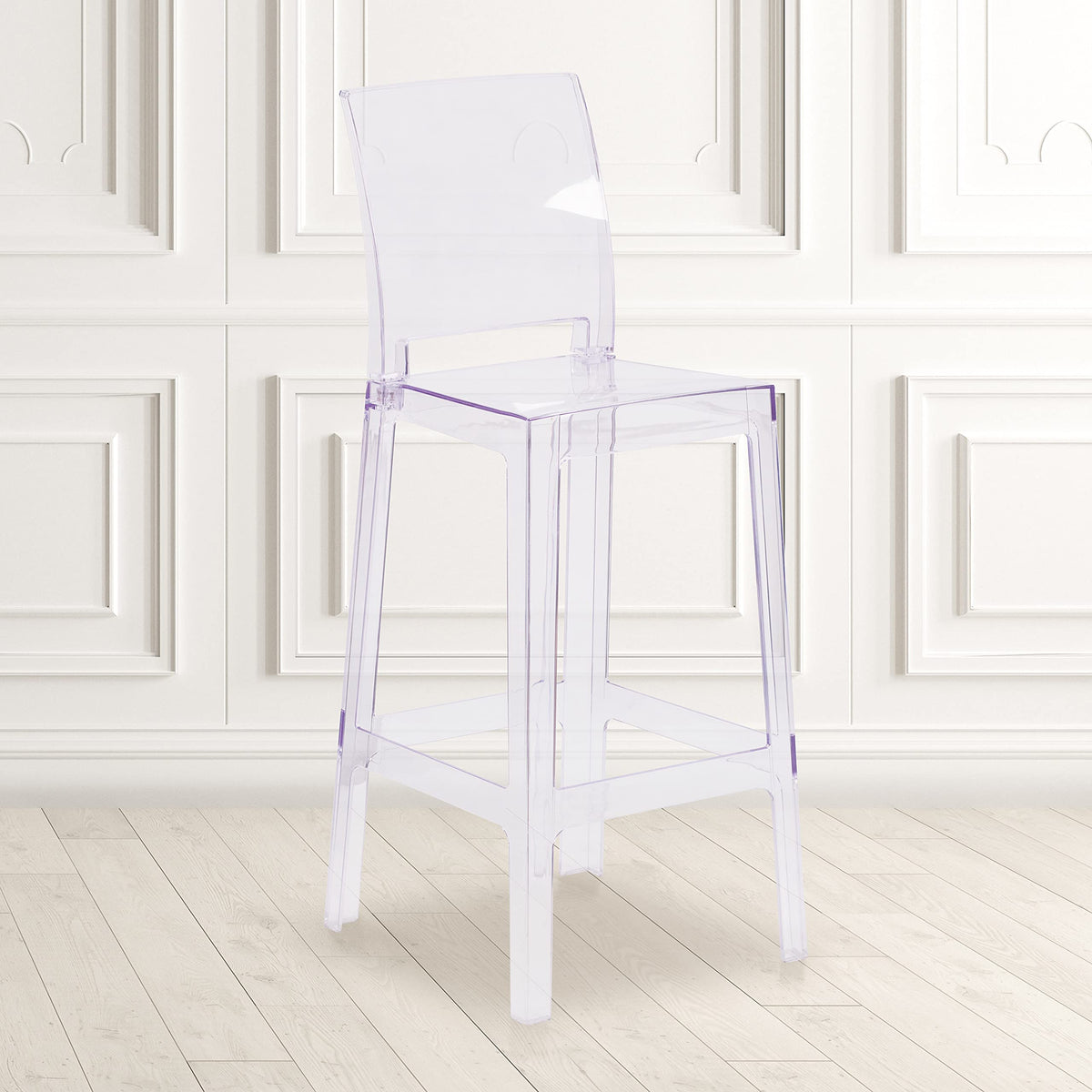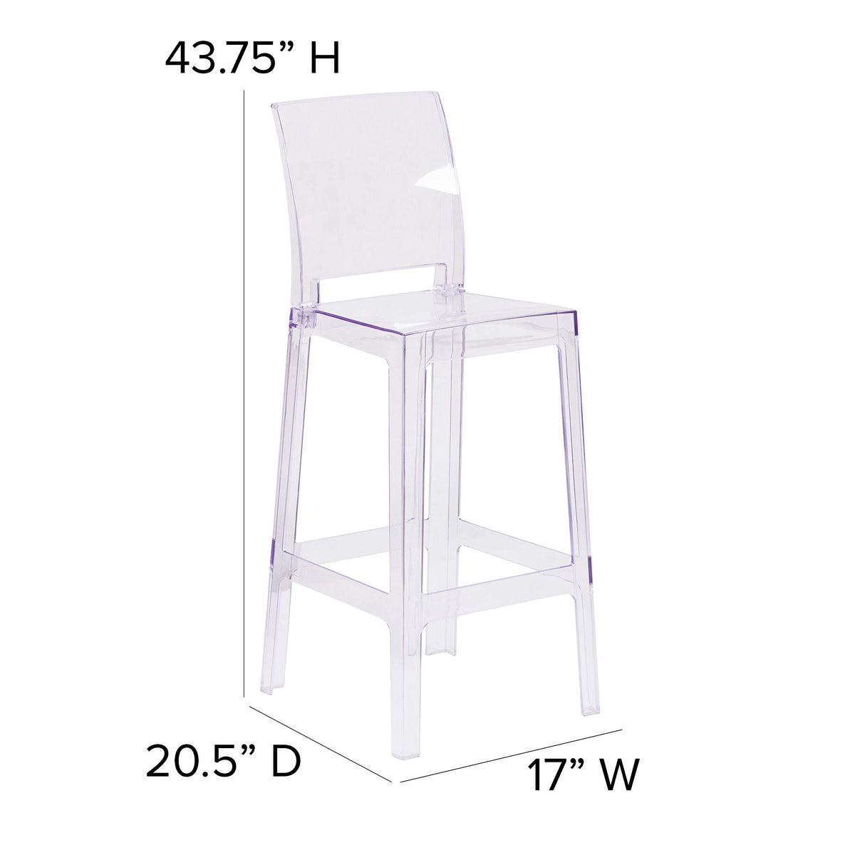The Transparent Barstool Brings Modern Design, Elegance And Function To Your Home, Restaurant And Special Events.This Modern Stool With Its Near Invisibility Highlights Your Artwork And Other Furniture, Lightens A Crowded Space And Can Make A Small Room Appear Larger. The Contoured, Polycarbonate Molded Seat Provides Comfort. Protective Floor Glides Protect Your Floor By Sliding Smoothly When You Need To Move These Beautiful Chairs.This Beautiful Chair Will Become Your Premier Choice For Both Indoor And Outdoor Events. Coordinate Your Ghost Chairs With Ghost Barstools For An Elegant And Diverse Appeal.