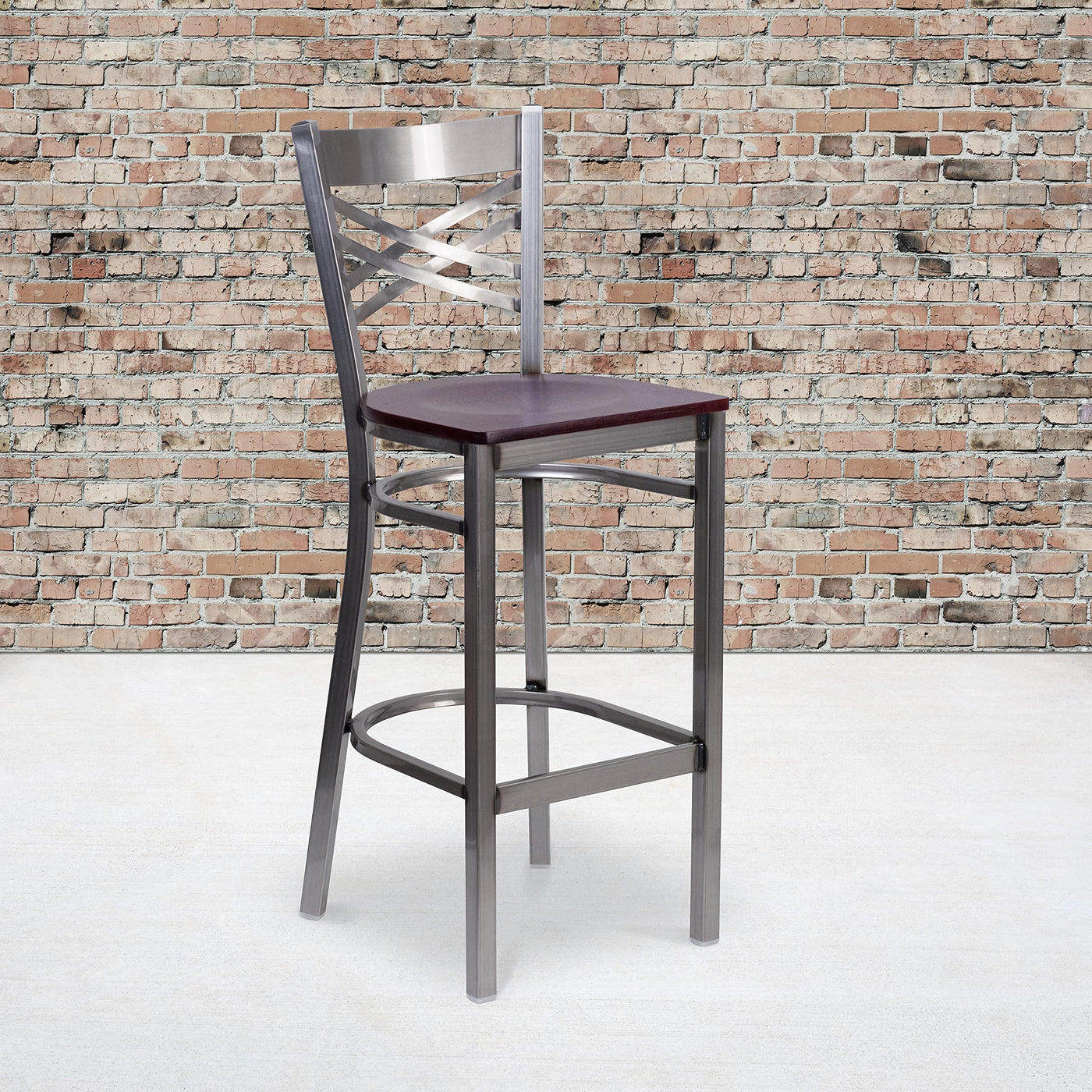 Flash Furniture Hercules Series Clear Coated ''X'' Back Metal Restaurant Barstool - Mahogany Wood Seat