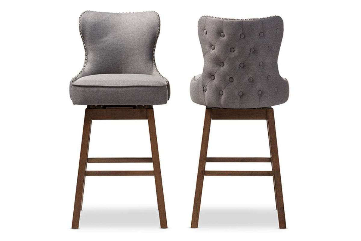 Featuring Modern And Contemporary Design, The Gradisca Upholstered Swivel Barstool Will Be A Perfect Addition To Your Kitchen Or Bar Counter. Constructed Of Solid Rubber Wood In Dark Walnut Finishing, The Barstool Will Be A Nice Addition For Your Warm And Cozy Kitchen And Dining Room. Button-Tufting Cut Out Backrest, Couples With Silver Nail Heads Trim Around The Seat Back Adds A Touch Of Modern And A Little Of Glamour To This Functional Barstool. Fully Upholstered In Polyester Fabric, The Upholstered Barstool Is Padded Throughout For Extra Comfort. Sit And Enjoy A Glass Of Martini With Your Loved One After A Long Busy Day For A Little Chit-Chat, The Gradisca Will Instantly Create A Lovely Ambience For The Occasions. Made In Malaysia, The Barstool Requires Assembly.Features Modern And Contemporary Swivel Barstoolfully Upholstered Back And Seat Tapered Legs With Stretcher Supportbutton-Tufting Designmade In Malaysiaassembly Requireddimensions: 44.49" High X 21.46" Wide X 21.85" Deep; Seating Dimensions: 30.51" High (From Floor) X 19.69" Wide X 17.32" Deep; Legs Height: 25" Highset Includes: Two (2) Bar Stoolsstyle: Contemporarymaterial: Fabric "Polyester 100%/Rubberwood/Mdf/Foamcolor: Grey/Walnut Brown