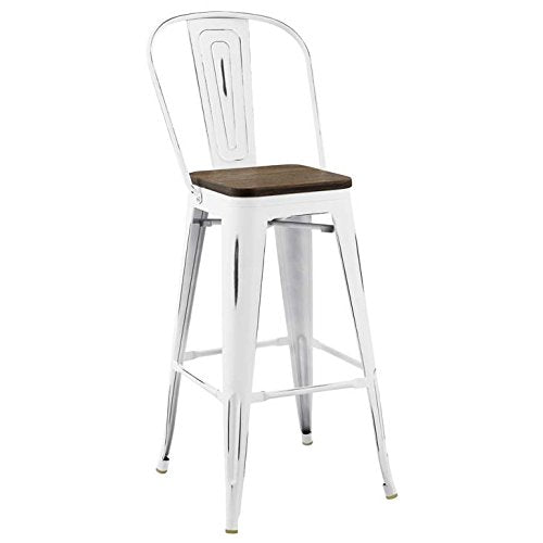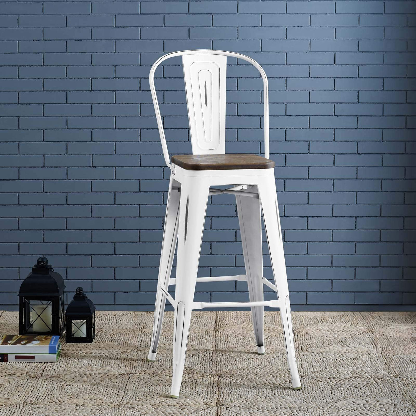 Modway Promenade Industrial Modern Steel Bistro Bamboo Seat In White, Metal Bar Side Stool