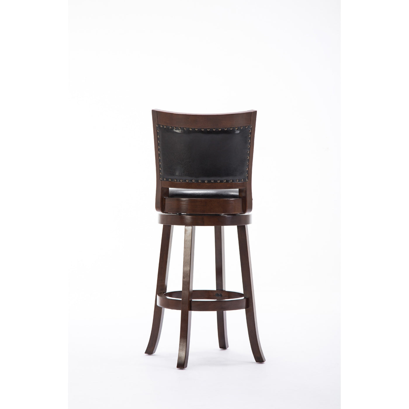 Add sophistication to your living area with this swivel barstool from our Shaw collection. Featuring a round padded seat with a 360 degree swivel mechanism and a panel backrest that is both comfortable and sturdy. Crafted with a quality hardwood frame and accented with brass nailheads, it is gorgeously upholstered in black vegan faux leather.