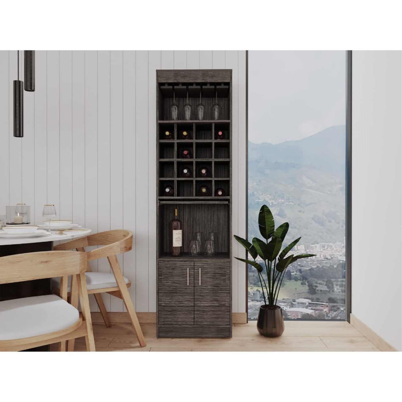 The Soria Bar Cabinet has you covered when it comes to organizing your bar. It brings modern style design that sure will impress your guests, it comes with a stem glass rack, 16-bottle rack for wine or liquor, a large open area below that's perfect for displaying your favorite decor and a underneath cabinet space give you all the storage you might need to keep any gathering going. It features a very convenient and concealable serving table that will help you prepare and serve your drinks, cocktails right there on the spot. Product dimensions are: 71.1in H x 20in W x 12.7In DFeatures Material: Glass Color: Smokey Oak Product Size: 20"W x 71.1"H x 13.3"D Texture: Porous Eviroment: Living Room Doors: 2 Shelves: 6 Made In China