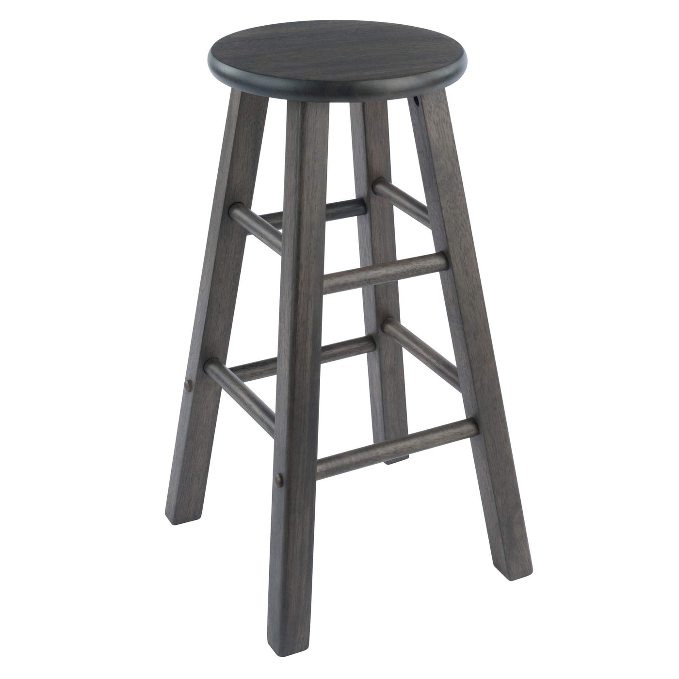 Spruce up your kitchen, breakfast nook, or den with this Winsome Element Counter Stool Set. Finished in a contemporary oyster gray finish, these stools feature a simplicity of design blending seamlessly with any decor from modern to farmhouse. They feature a more conservative foot print than many other flared-leg stools which give them a streamlined, contemporary look and allow them to be tucked neatly underneath a counter or table. At nearly 24" high these stools have a static weight of 220lbs. Crafted of solid wood, these stools have both high and low crossbars on all sides which provides stability while also serving as convenient footrests. The round seat is 12" in diameter, offering a generous seating area. The 2-piece set conveniently ships in one box that includes the hardware needed for assembly. Replacement part request can be submitted directly to the manufacturer within 60 days from date of purchase. Overall size: 13.39" x 13.39" x 23.86"H Weight capacity 220 lbs. Ships in 1 box Some assembly required