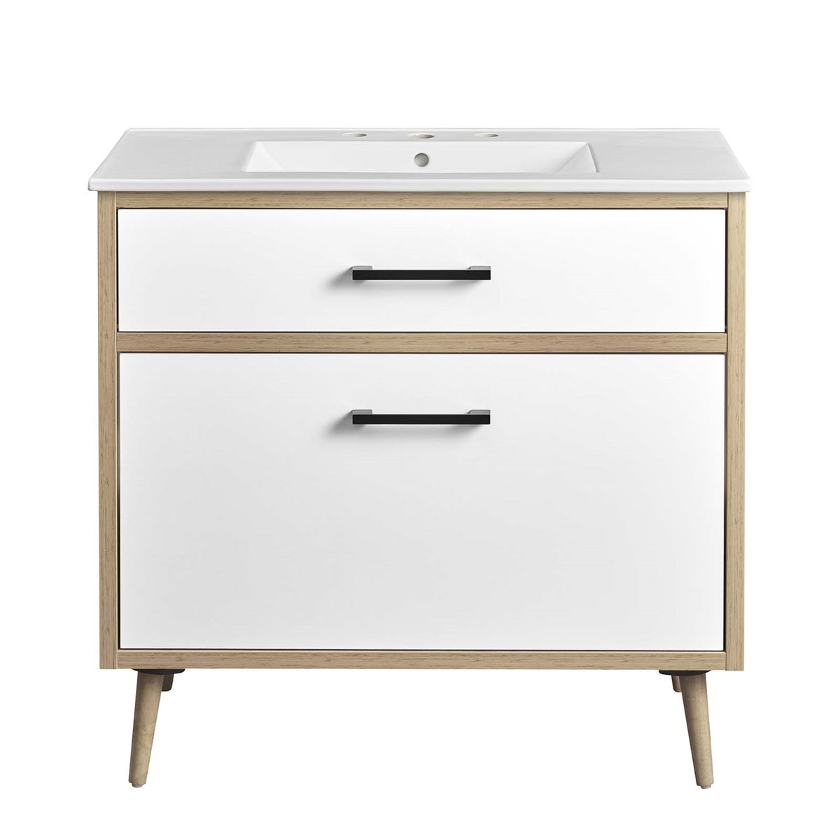 The Maverick 36'' Bathroom Vanity is the perfect blend of modern style and convenience. Crafted with particleboard and melamine, the simple yet elegant design is enhanced by modern metal handle pulls and tapered and splayed rubberwood legs. The spacious full-glide bottom drawer provides plenty of storage space for all your bathroom essentials, while the fixed top drawer adds complementing style. This bathroom vanity cabinet features a ceramic sink basin with an integrated countertop and 8'' centerset faucet holes. This bathroom vanity instantly transforms your space, creating a beautiful, modern look that will last for years. Includes non-marking foot glides to protect flooring. Assembly required. Fixtures not included. Set Includes: One - Cayman 36'' Bathroom Sink One - Maverick 36'' Bathroom Vanity Cabinet - Sink Basin Not Included