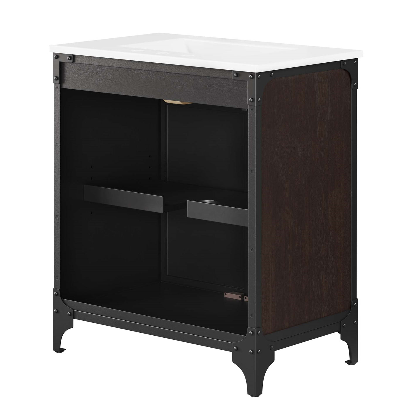 Experience the perfect blend of functionality and industrial modern style with the Steamforge 30 Bathroom Vanity. Crafted from sturdy metal with an antique patina and MDF with a beautiful wood grain veneer, this bathroom vanity cabinet brings a touch of utilitarian elegance to your bathroom decor. With pivot hinged double doors and spacious shelving complete with a plumbing cutout, this vanity provides ample storage space for all your bathroom essentials. The ceramic sink basin boasts an integrated countertop with 8 centerset holes, ready for your chosen fixtures (not included). With non-marking foot pads to protect your flooring, this bathroom vanity offers the ideal balance of design and practicality.Set Includes:One - Cayman 30 Bathroom SinkOne - Steamforge 30 Bathroom Vanity Cabinet