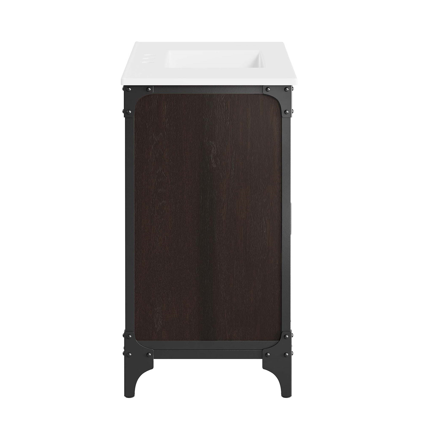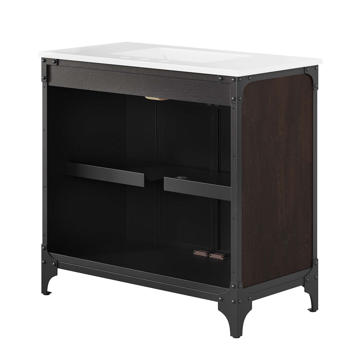 Experience the perfect blend of functionality and industrial modern style with the Steamforge 36 Bathroom Vanity. Crafted from sturdy metal with an antique patina and MDF with a beautiful wood grain veneer, this bathroom vanity cabinet brings a touch of utilitarian elegance to your bathroom decor. With a fixed drawer, pivot hinges on the double doors, and spacious shelving complete with a plumbing cutout, this vanity provides ample storage space for all your bathroom essentials. The ceramic sink basin boasts an integrated countertop with 8 centerset holes, ready for your chosen fixtures (not included). With non-marking foot pads to protect your flooring, this bathroom vanity offers the ideal balance of design and practicality.Set Includes:One - Cayman 36 Bathroom SinkOne - Steamforge 36 Bathroom Vanity Cabinet
