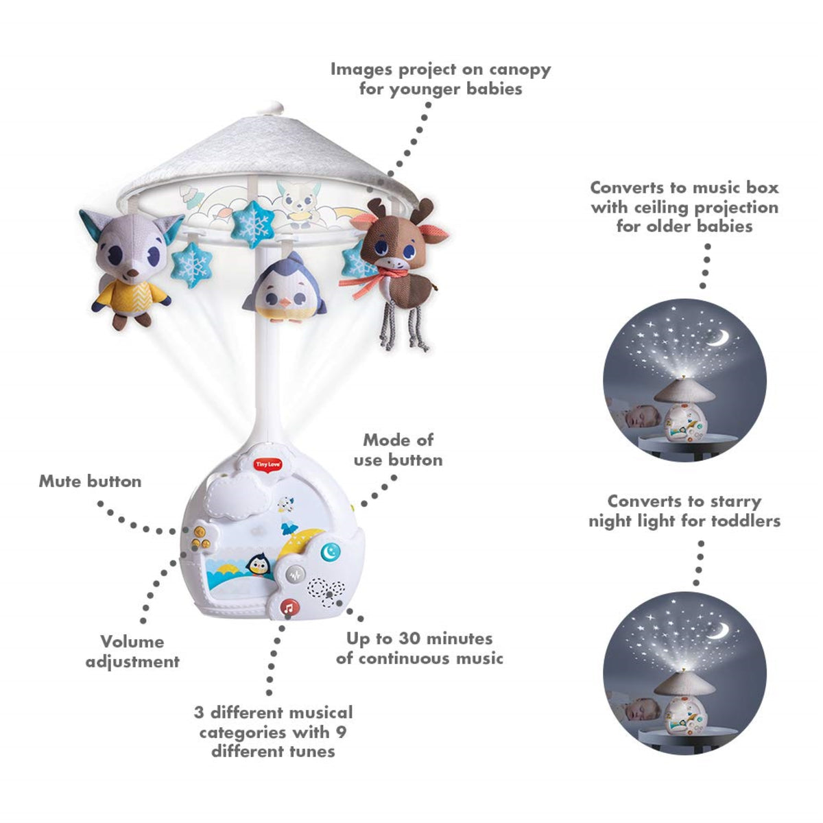 Q: How does the projection feature of the Tiny Love Magical Night Mobile work?A: The Tiny Love Magical Night Mobile projects a delightful array of stars onto the ceiling, creating a calming atmosphere that lulls babies into a peaceful slumber. The mobile's enchanting overhead canopy projection captures your baby's attention with playful animal movements.