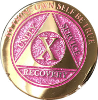 Premium Quality Bi-Plate 10 Year Aa Medallion In Elegant Glitter Pink And Gold & Silver Plated Design . Gold Plating Is Very Glossy, This Coin Looks Like Its Ready For A White Tie Affair. Serenity Prayer On The Back And Designed With Recessed Colored Lettering Around The Rim And Raised Triangle For A Great Look And Feel. Size Is 33Mm Or 1 5/16' Diameter. To Give It A Better 'Feel' And 'Weight' We Made It 12 Gauge Vs The Usual 14 Gauge Sobriety Coins So It Is 3Mm Thick. When You Hold It In Your Hand You'Ll Know The Difference. Comes In A Protective Vinyl Envelope. If You Need A Keychain Holder Search Amazon For B01Glowdjy Which Is The Asin For The Holder That Works With This Item.