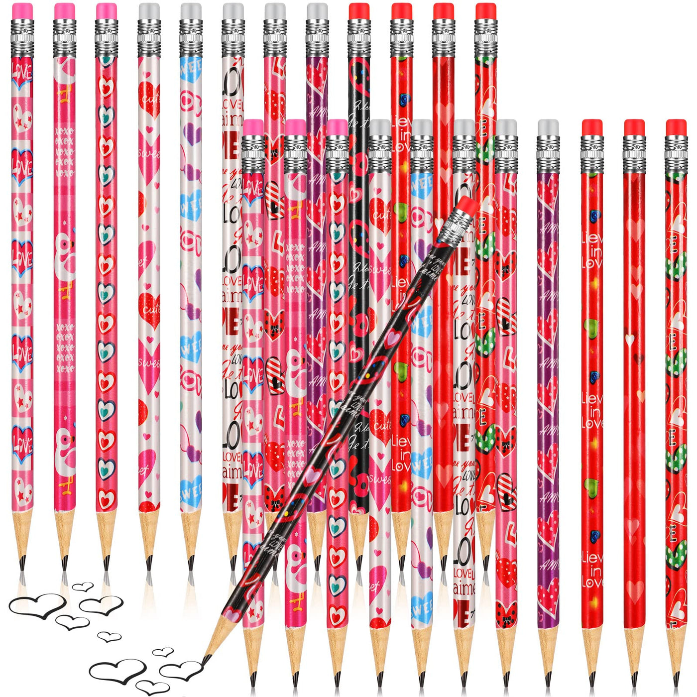 24 Pieces Valentines Pencils For Kids Class, Valentine'S Day Pencils, Colorful Pencils With Erasers, Love Heart Patterns, Wooden