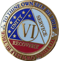 Premium Quality 6 Year Aa Sobriety Medallion In Reflex Red White And Blue Gold Plated Design . Great Patriotic Design With Stars And Colors Of The Usa. Perfect Sobriety Gift For A Veteran Or Patriotic Person. Serenity Prayer On The Back And Designed With Recessed Colored Lettering Around The Rim And A Textured Center Under The Fill. 1 5/16' Diameter And 3Mm Thickness Which Gives This Coin A Better 'Weight' And 'Feel'. It Really Feels Like A Premium Coin Yet Isn'T Heavy In Your Pocket. Comes With A Vinyl Protector Envelope. If You Need A Keychain Holder Search Amazon For B01Glowdjy Which Is The Asin For The Holder That Works With This Item.