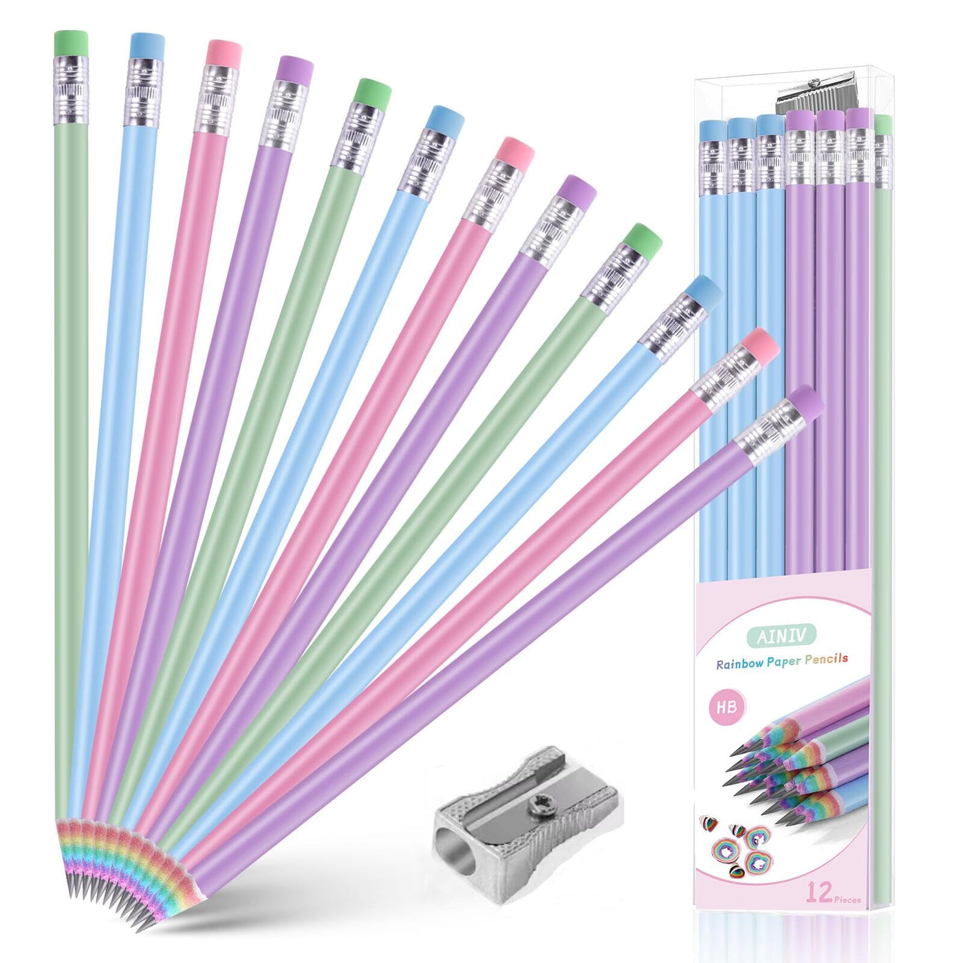 Ainiv 12Pcs Eco-Friendly Wood & Plastic Free Recycled Rainbow Paper Pencils #2 Hb Pencils Number 2 Pencils Erasers Toppers With
