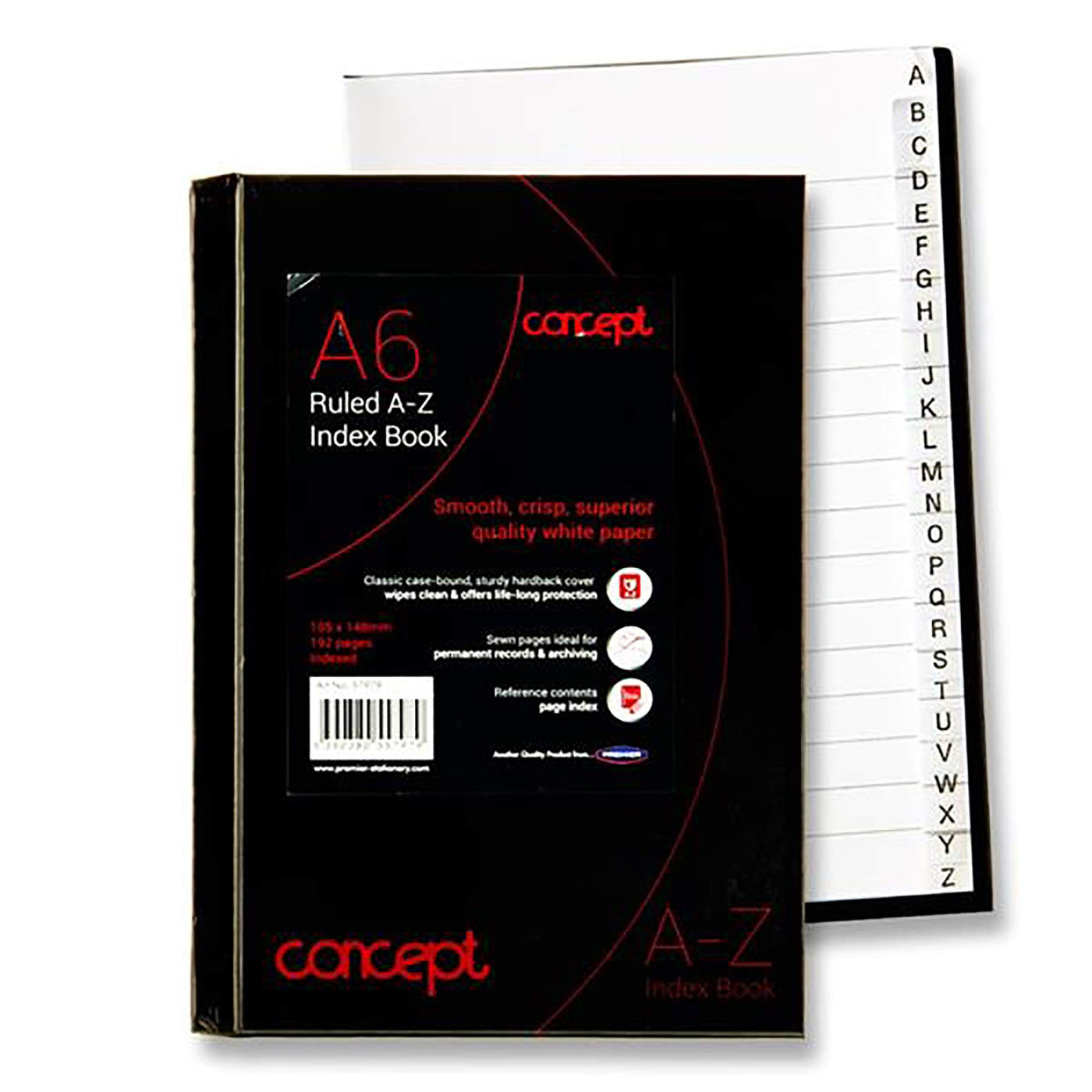 Premier Stationery Concept A6 Size, 192 Page, A-Z Index Hardback Notebook. Classic Case Bound Sturdy Hardback Cover, Wipes Clean & Offers Life Long Protection. Sewn Pages Ideal For Permanent Records And Archiving, 192 Indexed Pages With Personal Information Page At The Front Of The Notebook. Smooth, Crisp, Superior Quality Bright White Paper. Another Quality Product From Premier Stationery.