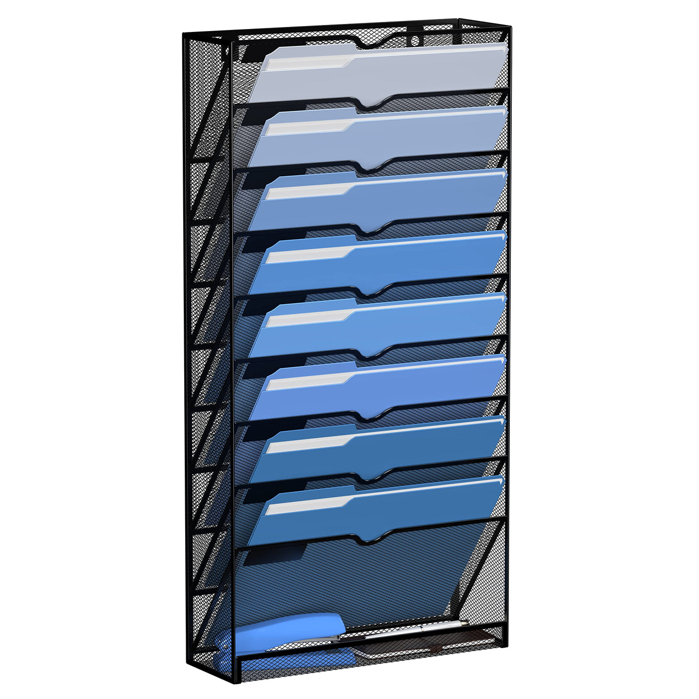 This Hanging Folder Organizer Includes A Metal Mesh Folder Holder And 3 Screws (1 Standby). The Organizer Has 10 Sections, With 9 Pockets And A Bottom Slot. The Holder Itself Does Not To Be Assembled. It Can Be Mounted On The Wall. The Size Of Our Product Is 12.60'L X 3.94'W X 15.75'H.