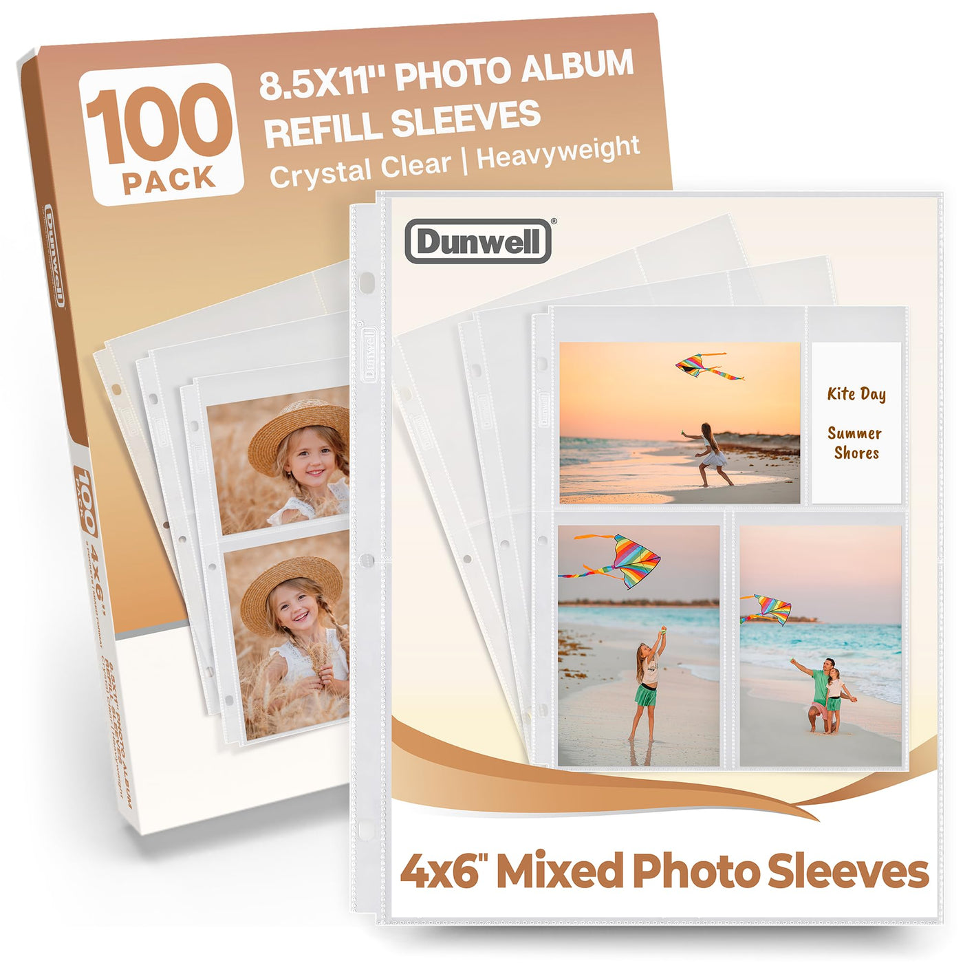 4X6' 3-Pocket Photo Sleevesdunwell 4X6 Photo Album Sheets Are Great For Preserving And Displaying Your 4 X 6 Pictures. Each Picture Protector Sleeve Holds Six Photos, Both In Landscape (Horizontal) Format And Vertical (Portrait). They Also Include A Small Memo Pocket Writing Area For Photo Labeling. Transparent Plastic Picture Pockets Are Top-Loading For Easy Access And Viewing.These Photo Album Pages For 3-Ring Binders Have A 3-Hole Punched Strip, And Can Be Used To Refill Photo Album Binders, Such As 4X6 Photo Album By Dunwell, And Other Standard 3-Ring Photo Sleeves Binders.Archival Photo Sleeves Offer Safe Long-Term Storage Of 4 X 6 Photos And Keepsakes. The Crystal Clear Durable Heavyweight Poly Plastic Used Makes These Photo Album Inserts Non-Cling And Non-Ink Transfer, And They Will Not Yellow Over Time.Plastic Photo Sleeves Have Many Creative Uses. Use Dunwell Clear Plastic Binder Sleeves For 4 X 6 Photos, Pictures, Scrapbook, Collector Cards, Recipe Cards, Postcard Sleeves, Seed Binder, Note Cards, Flash Cards, Index Cards And Photography. Proudly Display Your Artwork And Photos With 3.5X5', 4X6 And 5X6'Photo Album Refill Pages, Photo Binder Pages. And Check Out All The Archival Supplies By Dunwell!