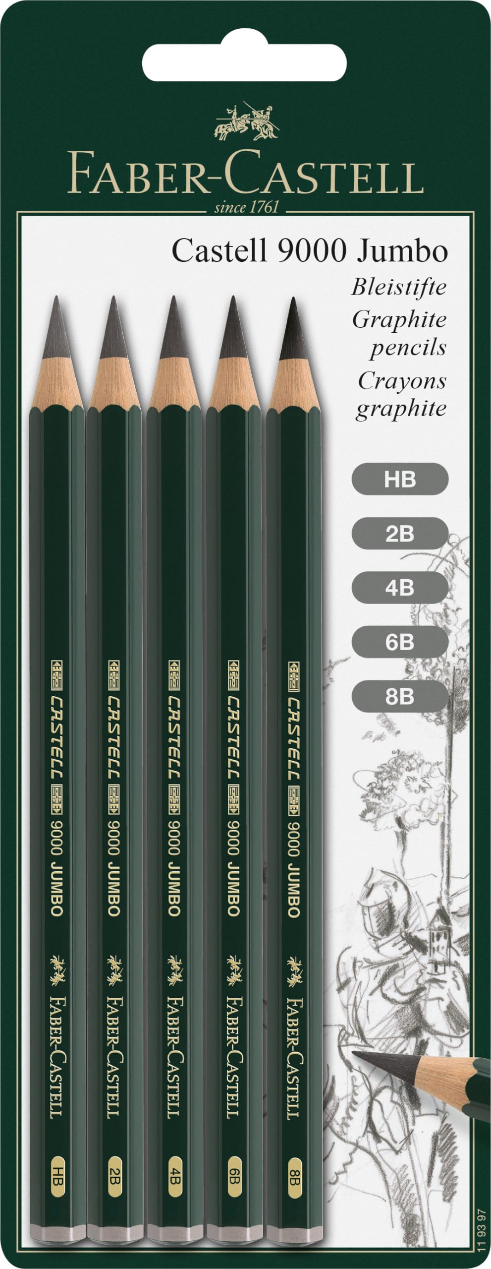Faber-Castell 5 Piece Quality Castell 9000 Jumbo Graphite Pencils Blister Card Set, Including Hb, 2B, 4B, 6B And 8B (119397)