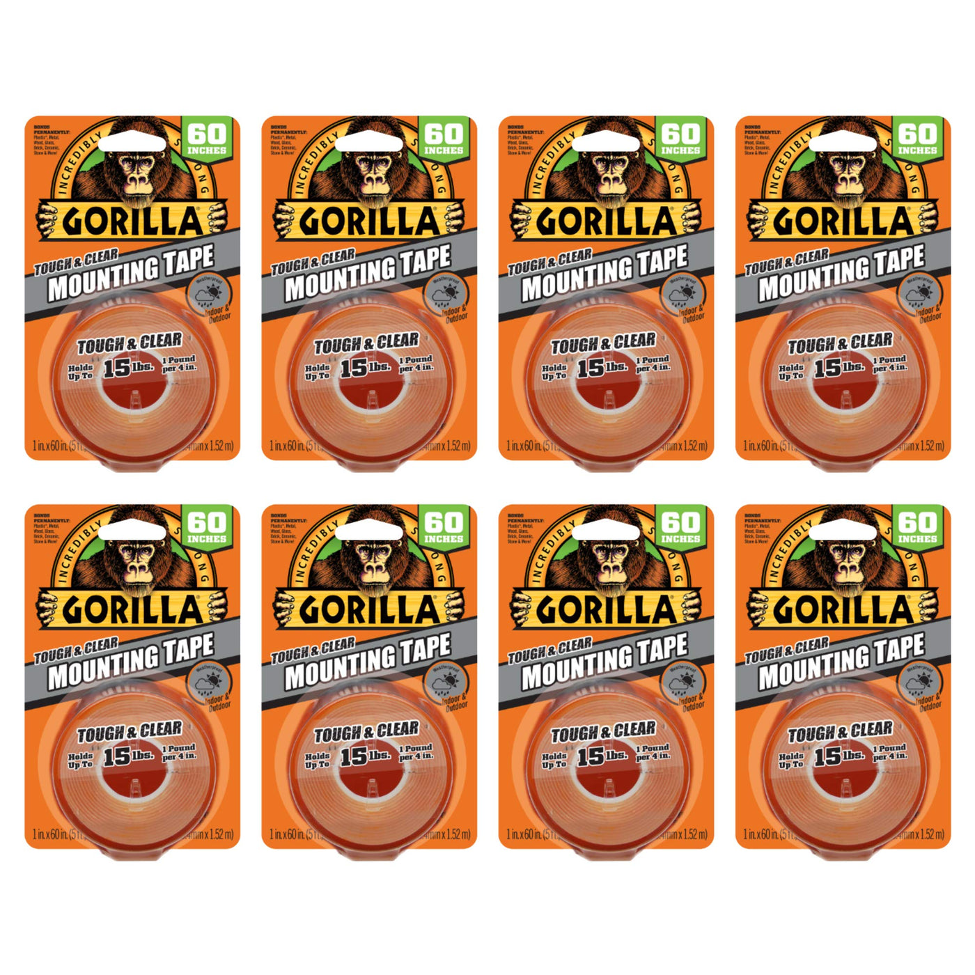 Gorilla Tough & Clear Mounting Tape Is A Clear Double Sided Tape That Mounts In An Instant, For A Long-Lasting, Weatherproof Bond. The Crystal Clear Two Sided Tape Wont Yellow Over Time, And Holds Up To 15 Pounds. Gorilla Tough & Clear Mounting Tape Is Perfect For Indoor And Outdoor Projects And Sticks To Smooth And Rough Surfaces. Completing Diy Projects Are Easy With This Tough, Double Sided Tape 8 Pack. Mount, Build, And Repair For A Perfect Finish, Every Time. Directions: Apply Tape To Back Of Object Vertically, Allowing For Even Distribution Of Weight. Avoid Touching Surfaces Of The Tape. Note: Apply 4 Of Tape Per 1Lb Of Weight. Cut The Tape And Press To Secure The Tape To Object. Remove Clear Liner And Align Objects To Desired Placement. Press Firmly, As Gorilla Mounting Tape Conforms To The Surface And Creates A Strong, Permanent Bond. Once Gorilla Mounting Tape Is Used To Mount An Object, It Is Meant To Be Held In Place Permanently, And Not Be Removed. The Package Contains 8, 60 Inch, Double Sided Strips Of Tape Designed For Walls And Windows Alike. Each 60' Strip Of Two Sided Tape Heavy Duty Sticks To Almost Any Indoor Or Outdoor Surface. Follow The Gorilla Link At The Top Of This Page To See Other Quality Products From The Gorilla Glue Company.