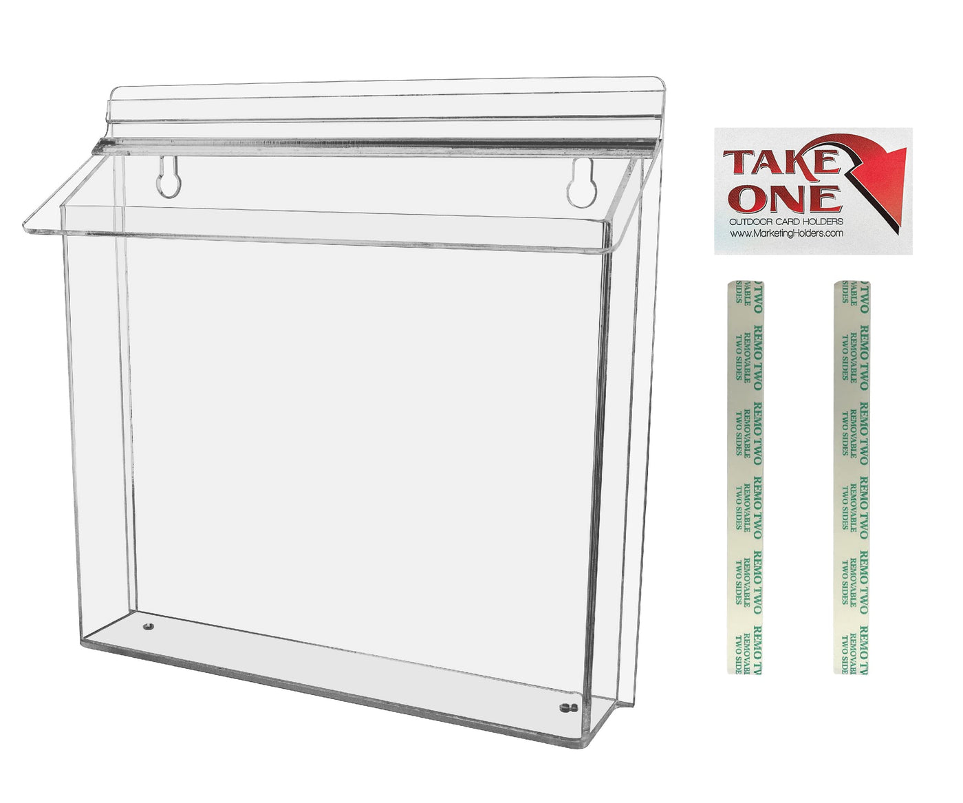 11'W X 8.5'H Outdoor Flyer Holder Wall Brochure Box With Lid Product Features: Wall Mount Outdoor Holder For 11'W X 8.5'H Literature Pocket Dimensions: 11.5'W X 1.75'D X 8.5'H. Overall Dimensions: 11.75'W X 2.5'D X 12.25'H. Thickness: 0.118', 1/8', 3Mm Includes: Brochure Holder With Lid, 2 Strips Of Peel And Stick Adhesive And One 'Take One' Sticker Proudly Made With Premium High Quality Acrylic Marketing Holders Outdoor Display Holders Make Sure You Never Miss Out On Potential Customers. Simply Mount Your Outdoor Flyer Box Outside Your Brick And Mortar Business. These Are Perfect For Menus In Front Of Restaurants. Many Other Businesses Keep Their Maps Or Business Information Pamphlets On The Wall Inside Or Outside Their Front Door. This Take One Holder Is Super Durable And Has A Clear Front To Show Your Literature. Mount It On Walls, Sign Posts, Or Other Solid Surfaces And Start Advertising Today. Designed With Versatility In Mind, The Printed Material Bin Comes With 2 Adhesive Strips For Simple Wall Installation Or, Use The Pre Drilled Holes To Mount. All Of Our Outdoor Brochure Holders Come With A Lid To Help Keep Water And Dirt From Drifting In. These Are Not Waterproof But Durable To Withstand The Elements. This Literature Rack Is Great For High-Traffic Areas Such As Strip Malls, Kiosk Booths, Welcome Centers, City Parks, Boat Docks, Hotel Fronts And Real Estate Offices. These Document Boxes Also Help Companies Market Themselves Without Any Effort From The Business Owner. Our Literature Boxes Provide Every Business With An Inexpensive Exterior Advertising Solution. Exterior Document Display Boxes Are Effective For Generating Interest In A Company. *All Sizes Are Approximate **Item Is Water Resistant, Not Waterproof ***Tolerances: Thickness +/- 10%