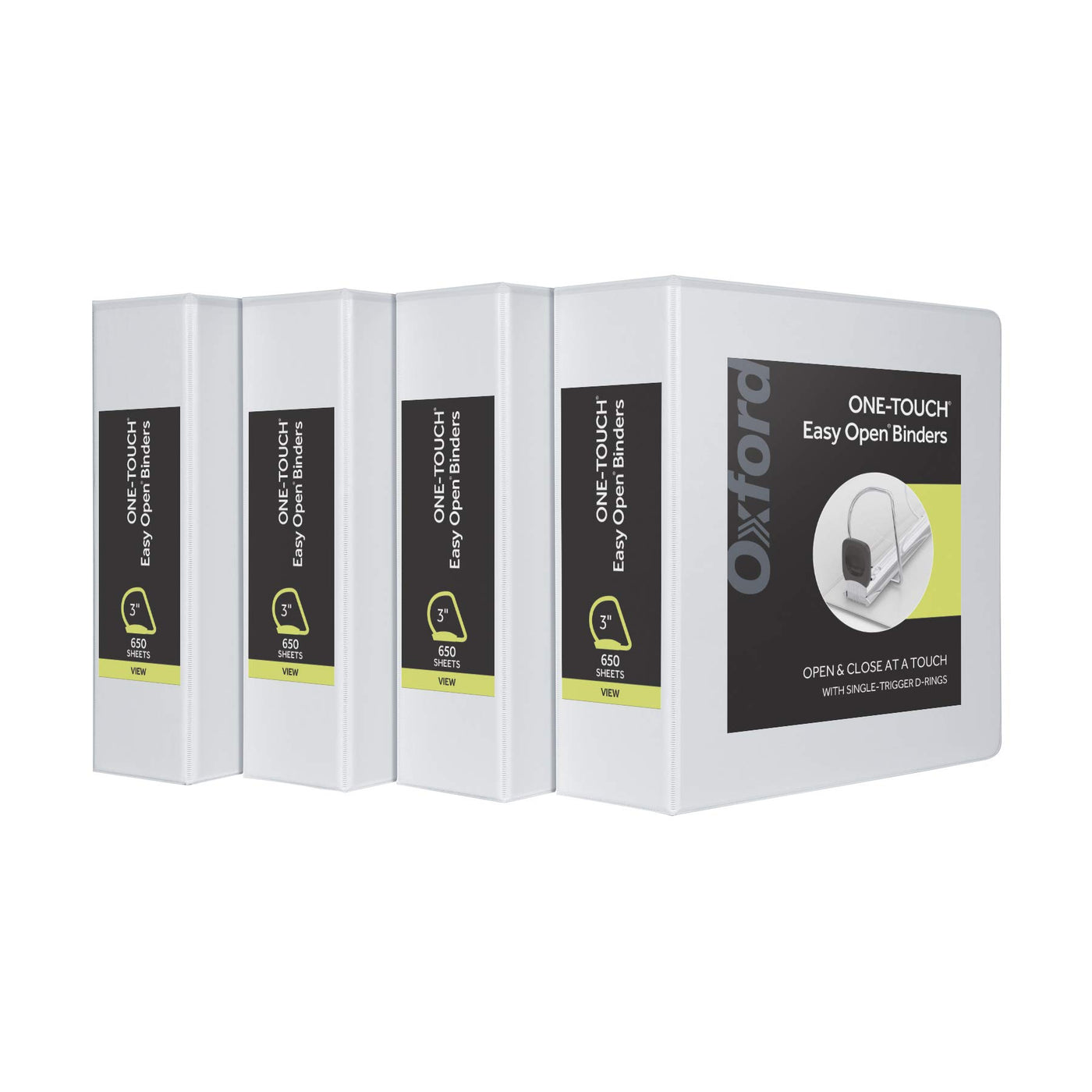 These Oxford One-Touch Easy Open Binder 4-Packs Are Great For School, Home Or Office Use. Single Trigger One-Touch Binders Make Loading And Organizing Pages Easy And Simple. Xtralife Hinges Are Durable And Made To Last. Hinges See To It That You Avoid Tears Or Splits At The Seams When You'Re Using Your Binder. Oxford Binders Are Pvc-Free And Non-Stick And Resist Ink And Smudges. Binder Set Is Ergonomic And Great For Stocking Up. Each Binder Has Two Clear Pockets For Your Syllabus, Handouts Or Notes. Perfect For Presentations At Work Or School. Each 3-Inch Binder Holds 650 Sheets. White. 4 Pack. (79915)