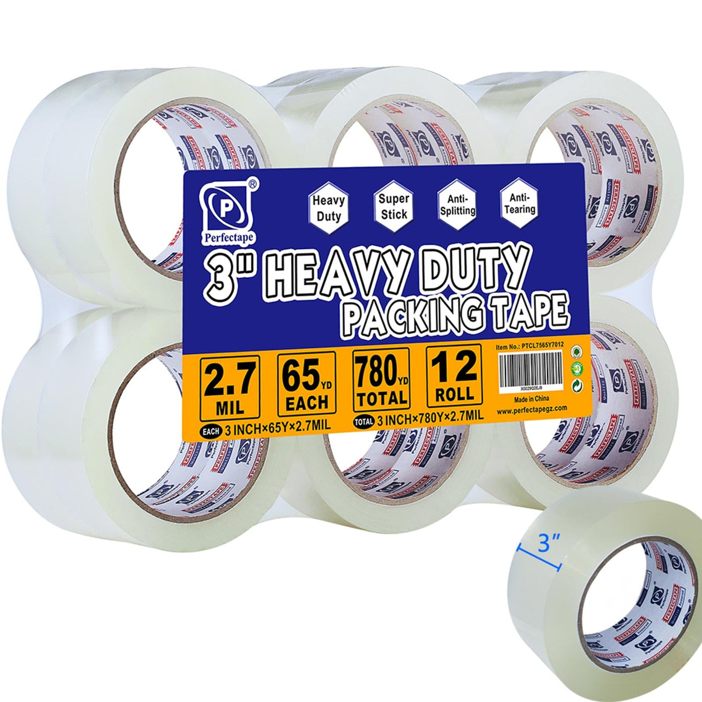 Perfectape 3' Heavy Duty Packing Tape 12 Rolls, Total 780Y, Clear, 2.7 Mil, 3 Inch X 65 Yards, Ultra Strong, Refill For Packagi