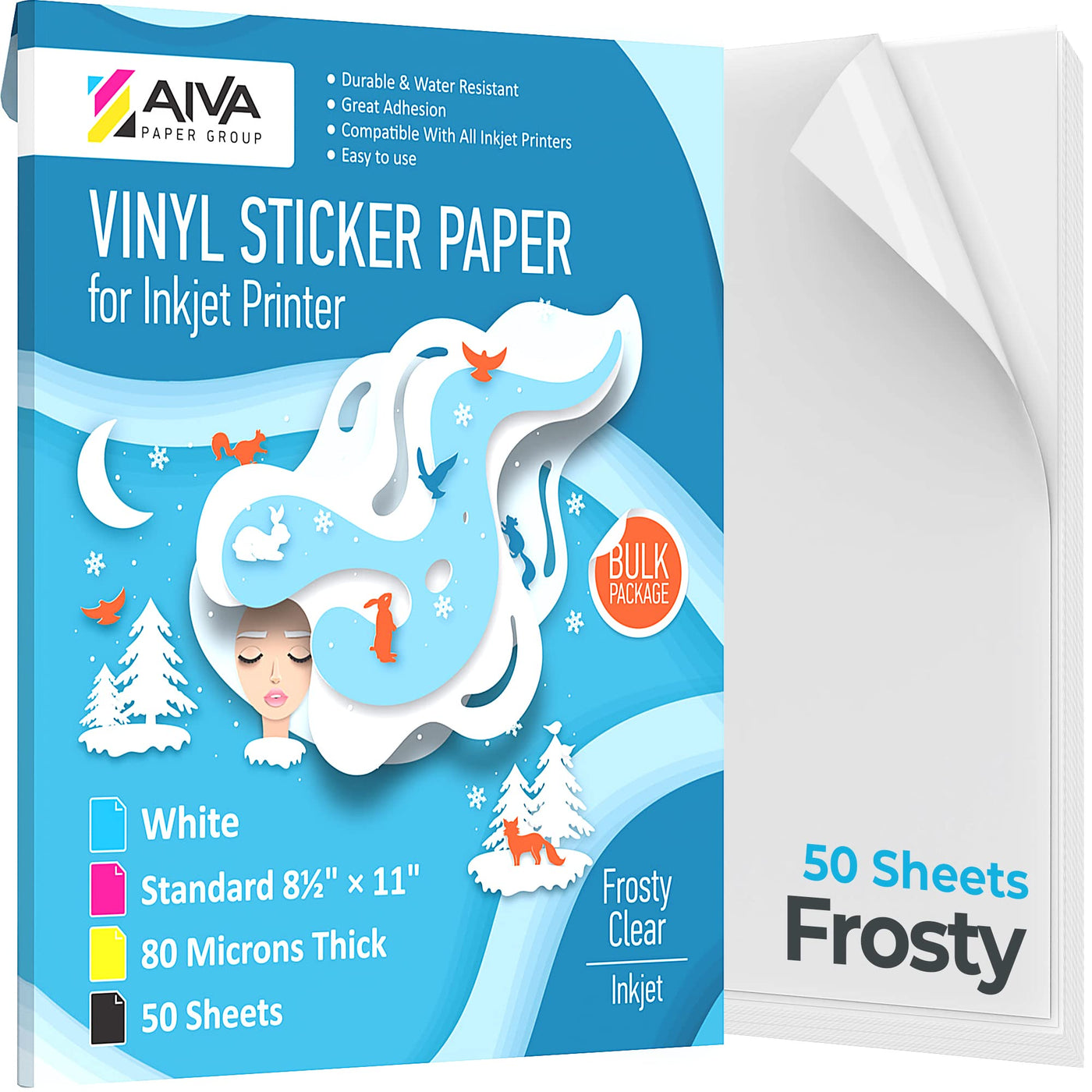 Aiva Paper Group Printable Vinyl Sticker Paper - Frosty Clear - 50 Self-Adhesive Sheets - Standard Letter Size 8.5'X11' Printable Vinyl Sticker Paper - Endless Possibilities For Your Creativity! This Material Sticks Great To Any Smooth, Hard Surface Like Glass, Plastic, Metal And More. These Printable Stickers Have A Removable Adhesive Which Will Allow You To Make Small Adjustments If The Label Is Applied Crooked, And Will Remove Cleanly With No Adhesive Left Behind. These Stickers Are Waterproof, Dishwasher Safe, Microwave Safe, And Scratch Resistant.Frosty Clear Vinyl Labels Are A Great Addition To Any Project. This High Quality Material Is Durable, Waterproof, And Has A Removable Adhesive. The Main Difference Of Frosty Clear Vinyl - It Is The Look And Feel. Frosty Clear (Or Semi-Transparent) Vinyl Allows Surface Color To Be Seenwhich Makes Borders Of Stickers Less Visible. We Recommend This Label Material For Labeling Gourmet Food Products, Jars, And Bottles, Or Handmade Luxury Goods.The 8.5X11 Paper Sheets Are Compatible With Most Inkjet Printers And Craft Cutters. Diy Project Or Business Needs? Need Name Tags, Favor Tags, Address Labels, Wine Stickers?. Printable Vinyl It Is A Great, Cheap And Universal Solution!Easy Printing &Amp; Application: Print A Test Copy On A Normal Sheet Of Paper Using The Suggested Printer Settings Select Glossy + Best Printing Settings And The Correct Size - 8.5X11 Inch Use Only 1 Sheet At A Time To Avoid Paper Jams Print And Let The Results Dry For 5 Minutes Cut Your Print And Round Out Any Corners Clean And Dry Surface Before Applying The Vinyl Sticker Afterward Use Uv Ink For Increase Durability And Achieve Full Waterproofness, Especially When Using Outdoors,Allow The Ink To Dry For 24 Hrs And Apply A Clear Uv
