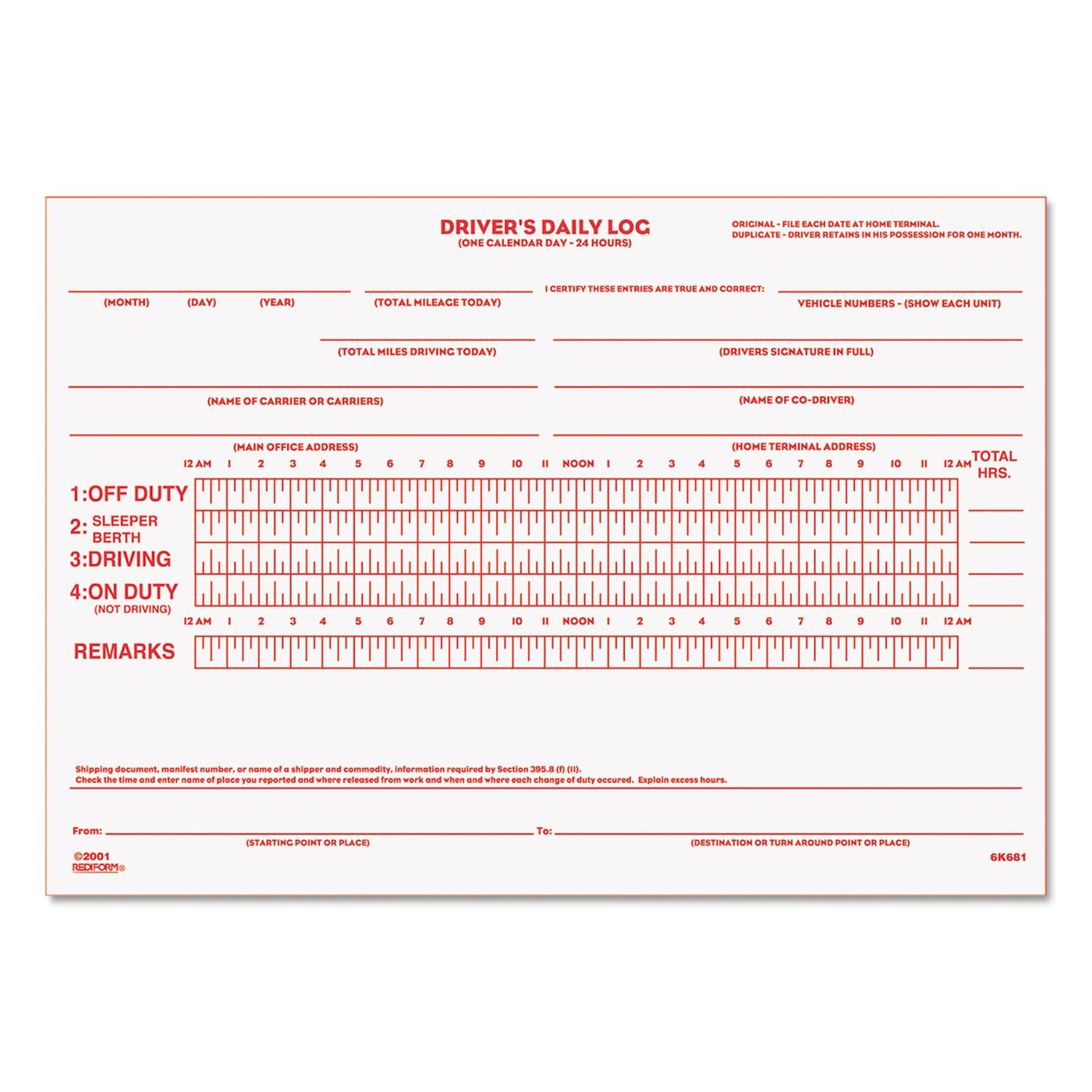 Rediform Driver'S Daily Log Book, Carbon, 2 Part, 5.5 X 7.875 Inches, 31 Forms (6K681)