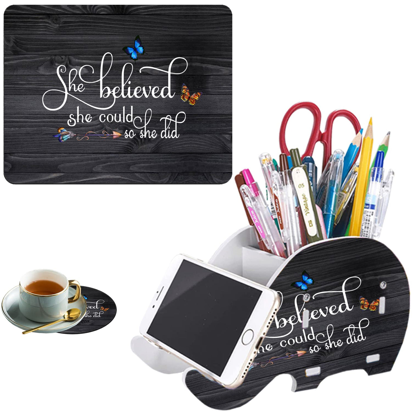 Set Creativity:3 Piece Tabletop Set, Cushioned In Quality Durable Fabric, Unique Patterned Print Design, Fine Stitched Edges, Pictographic Pen Holder And Cute Coasters. Suitable For Office Workers, Game Lovers And Students. Feature:- Use A Comfortable And Smooth Surface- Protect Your Desk From Dampness And Scratches- Rubber Textured Underside Of Cushion For Non-Slip- Multi-Functional Pen Holder, Keep The Table Clean- Waterproof And Easy To Clean- Hd Graphic Printing Designsize:Table Cushion: 9.4*7.9*0.08 Inchtablet Stand(Pen Holder): 7.1*3.1*4 Inchcup Coaster: 3.93*3.93 Inchmaterial:Desktop And Roller Coaster: Surface Lycra Fabric +Bottom Natural Pu Rubbertablet Computer Bracket (Pen Frame): Wooden Plastic Boardnote: Items With Different Materials May Have Slightly Different Colorspackage Included:1*Extended Large Mouse Pad1*Pencil Holder Phone Stand (Cute Pictographic Pen Holder)1*Cup Coaster If You Have Any Questions, Please Contact Us By Email And We Will Reply Within 24 Hours.