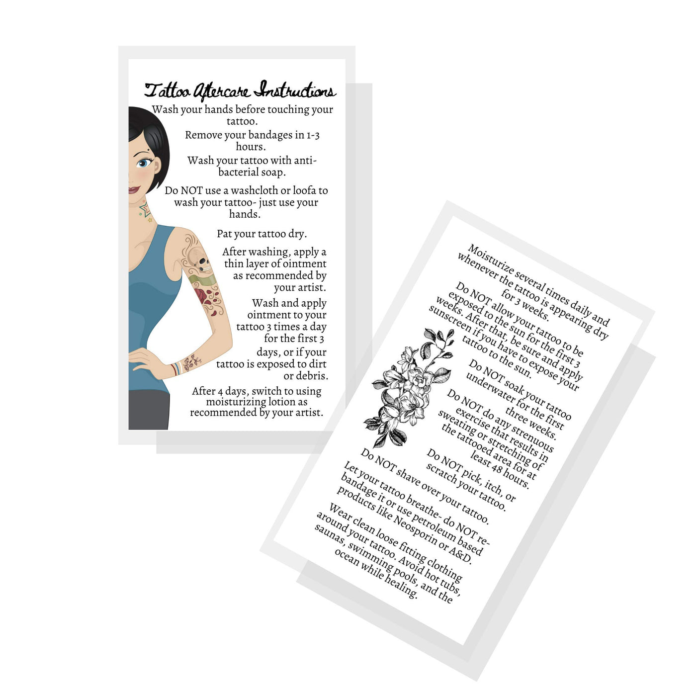 Tattoo Aftercare Instructions Cards | 50 Pack | Double Sided Size 2 X 3.5' Inches Business Card | White With Tattooed Lady Desi