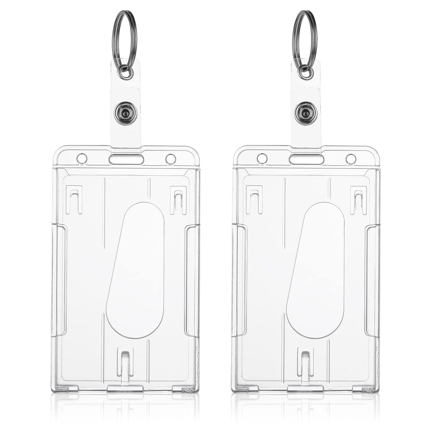 Tiesome Id Card Badge Holder With Keyring, 2 Pack Heavy Duty Badge Holders Keychain Hard Plastic Clear Card Protector Thumb Slot