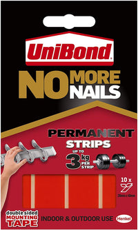 High-Strength Adhesion For A Range Of Mounting Needs - With The Unibond No More Nails Permanent Strips!Offering Fast And Easy Adhesion, The Versatile Double-Sided Mounting Strips Are Designed For Mounting Jobs Both Inside And Outside The House. The Practical Sticky Strips Provide Permanent Adhesion For A Range Of Uses Including Mounting Hooks, Signs, Numbers, Pictures, Car Number Plates Etc. The Two Sided Tape Is Able To Hold Up To 3Kg Per Strip Under Ideal Conditions (I.E. Mounting Smooth Flat Objects Less Than 10Mm Thick To Metal) And Will Adhere To Most Building Materials* Including Wood, Ceramic, Tiles, Metal, Brick, Stone And Most Plastics. The Heavy Duty Tape Is Waterproof And White In Colour, Ensuring Long-Lasting Durability And Discreetness Both Inside And Outside The Home.To Apply: Apply Only To Clean, Dry, Sound Surfaces Which Are Free From Dust, Oil, Grease, Polish And Moisture. For Best Results Clean Surfaces With Methylated Spirit. Prime Dusty Or Porous Surfaces And Allow To Dry. Apply Strip To Object And Press Down Firmly. Remove The Red Liner And Carefully Apply To The Surface Pressing Down Firmly. For Light Objects E.G. Signs And Number Plates, Adhere Strips (Slightly Shorter Than The Object) Every 25-30Cm. Mounted Items Cannot Be Repositioned. Maximum Adhesion Is Reached After 24 Hours, Support Heavier Items For 24 Hours.The Product Benefits At A Glance Double-Sided Mounting Strips For Interior & Exterior Use Hold Up To 3Kg Per Strip For Most Building Materials* Waterproof Colour: White Format: Pack Of 10*Not Suitable For Mounting Mirrors. '