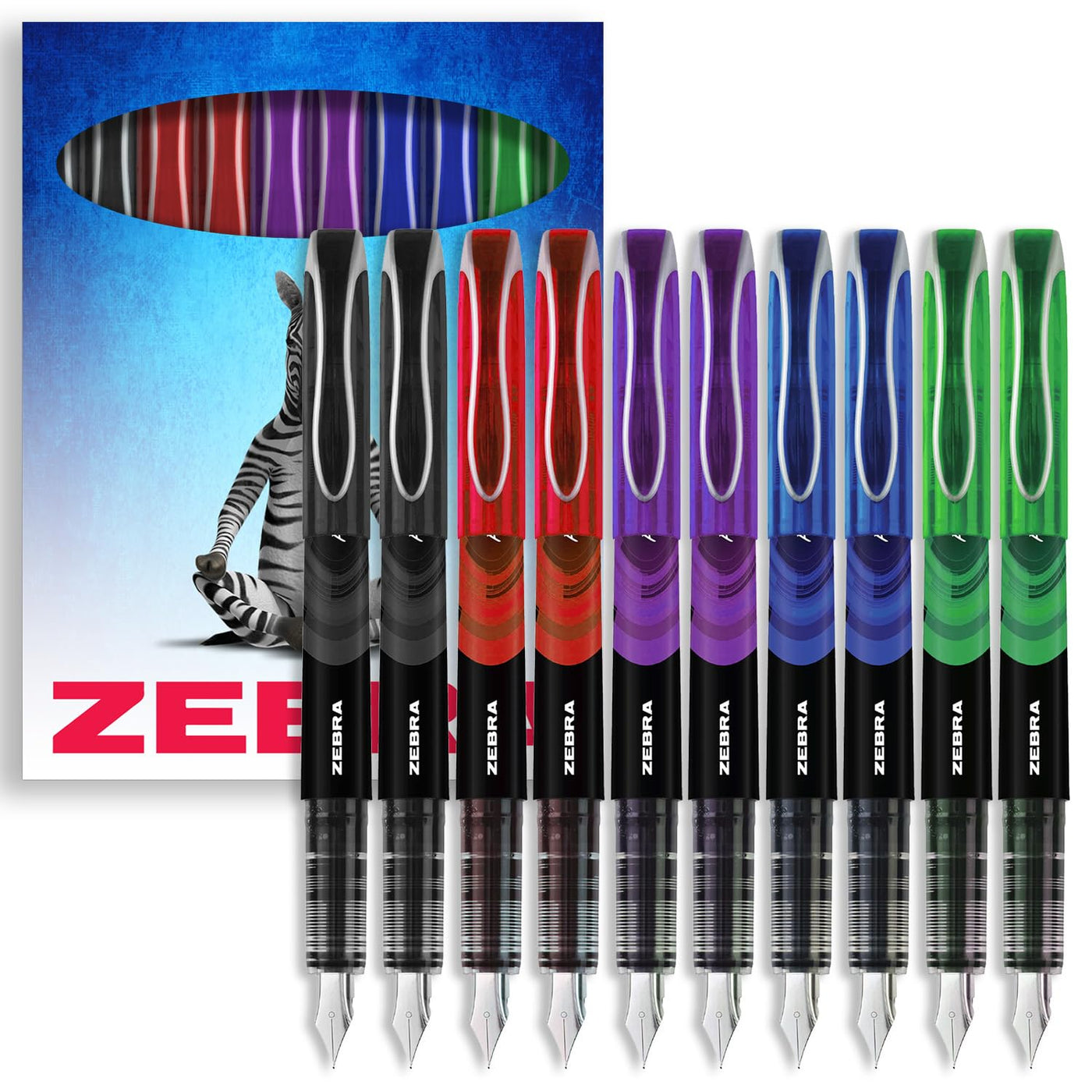 Zebra Fuente - Disposable Fountain Pen - Black, Blue, Red, Green & Violet Coloured Ink - Pack Of 10