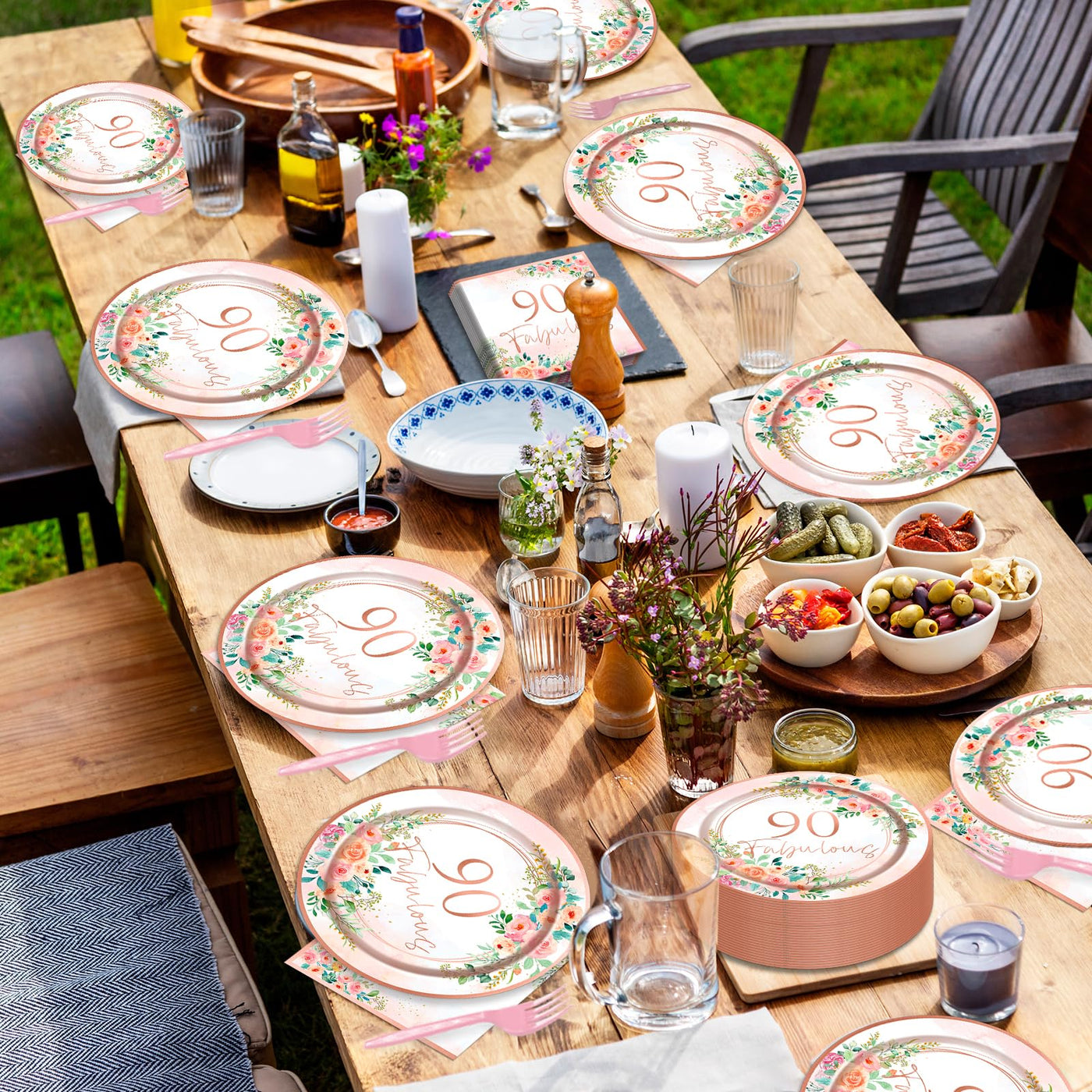 gisgfim Rose Gold 90th Birthday Party Tableware Set - 50 Guests, 200PCS Floral Paper Plates & Napkins, Fabulous Party Decorations