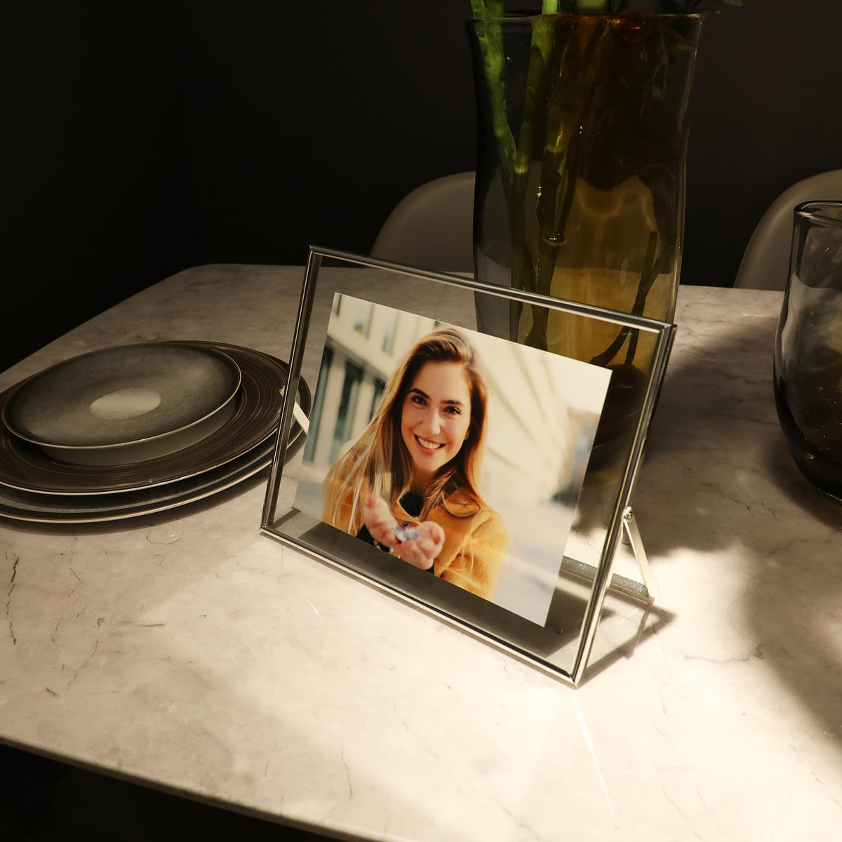 Q: What materials are used in the AhaGo Silver Floating Frame?A: The frame is constructed with a durable metal frame and features a double-sided genuine glass panel, ensuring high-quality durability and an elegant display for your cherished memories.