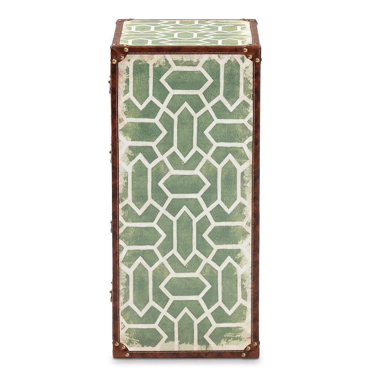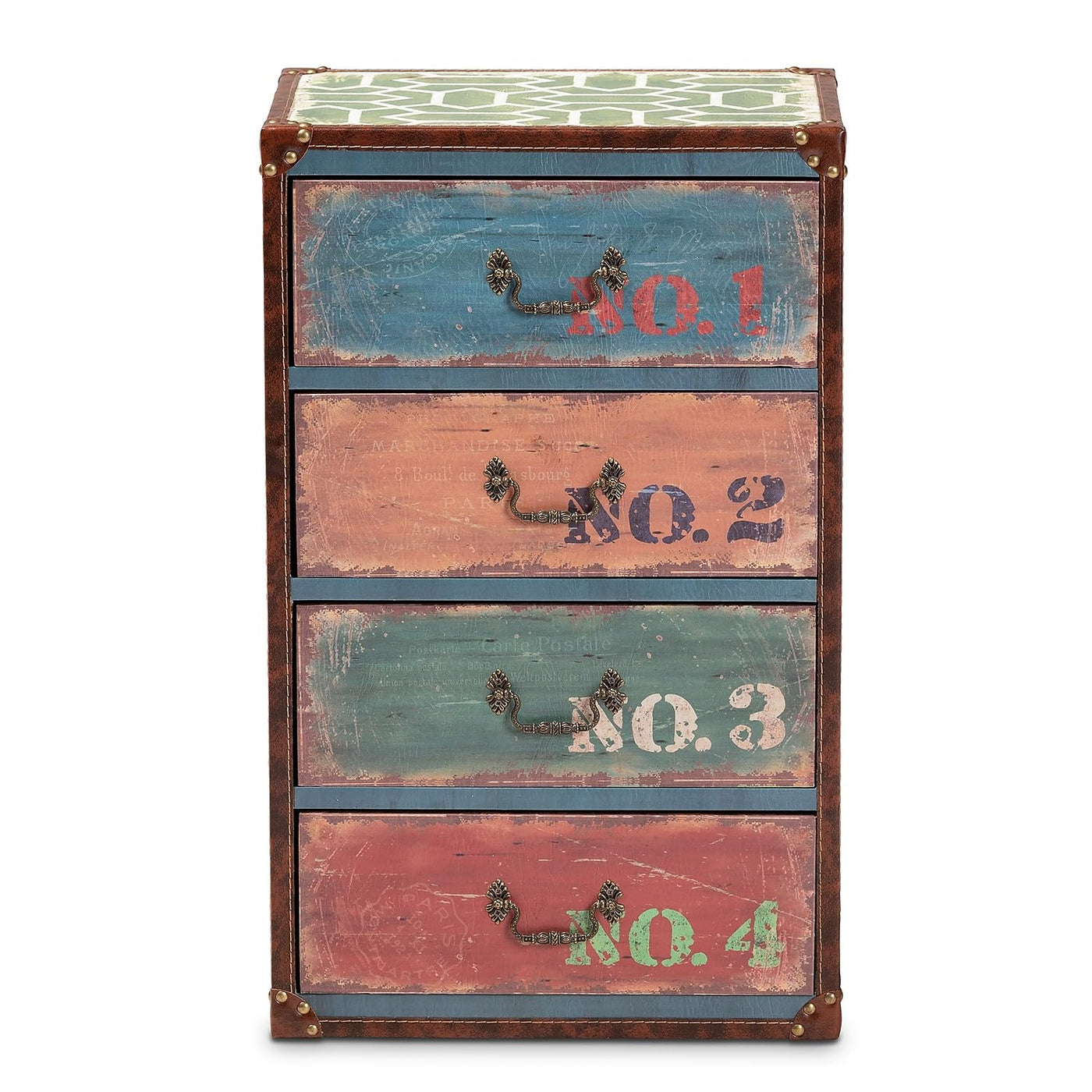 Give your space a unique, Parisian aesthetic with the convenient Amandine cabinet. The Amandine is made in China and presents a prominent design of green and white diamonds on its sides. Each drawer features a unique color and is fitted with decorative brass metal handles, displaying its exceptional craftsmanship. Distinctive faux leather bands, studded with gold colored stitching and pins, line the angles of the Amandine to make it reminiscent of a suitcase with a long history of travel. Fully assembled, its weathered finish conveys the illusion that the Amandine cabinet holds a storied past before reaching its place in your home.