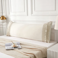 Q: What are the dimensions of the Beige Tassel Body Pillow Cover?A: The Beige Tassel Body Pillow Cover measures 20 inches by 54 inches, making it an ideal fit for standard body pillows.
