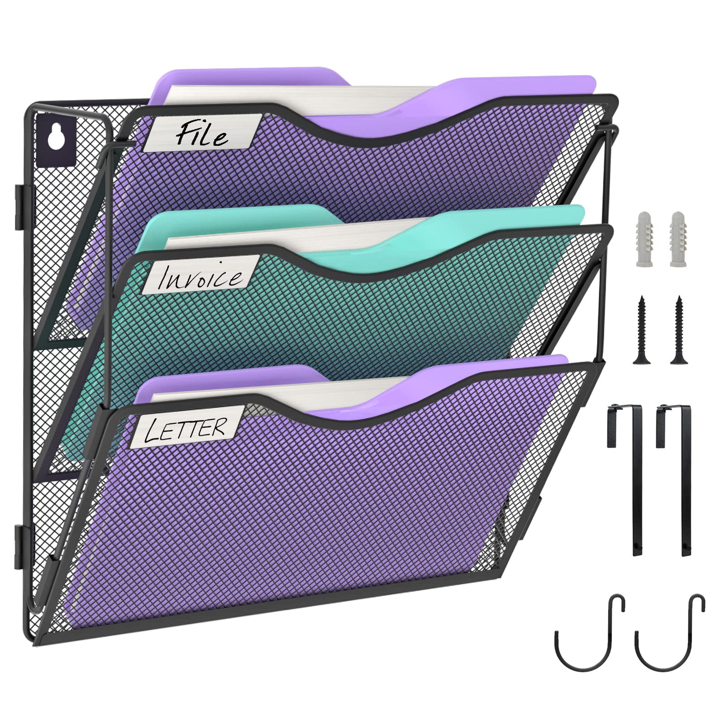 Bohdk 3 Pocket Mesh Hanging Wall File Organizer, Wall Mounted Mail Paper Document Folder Holder, Foldable File Folder Organizer