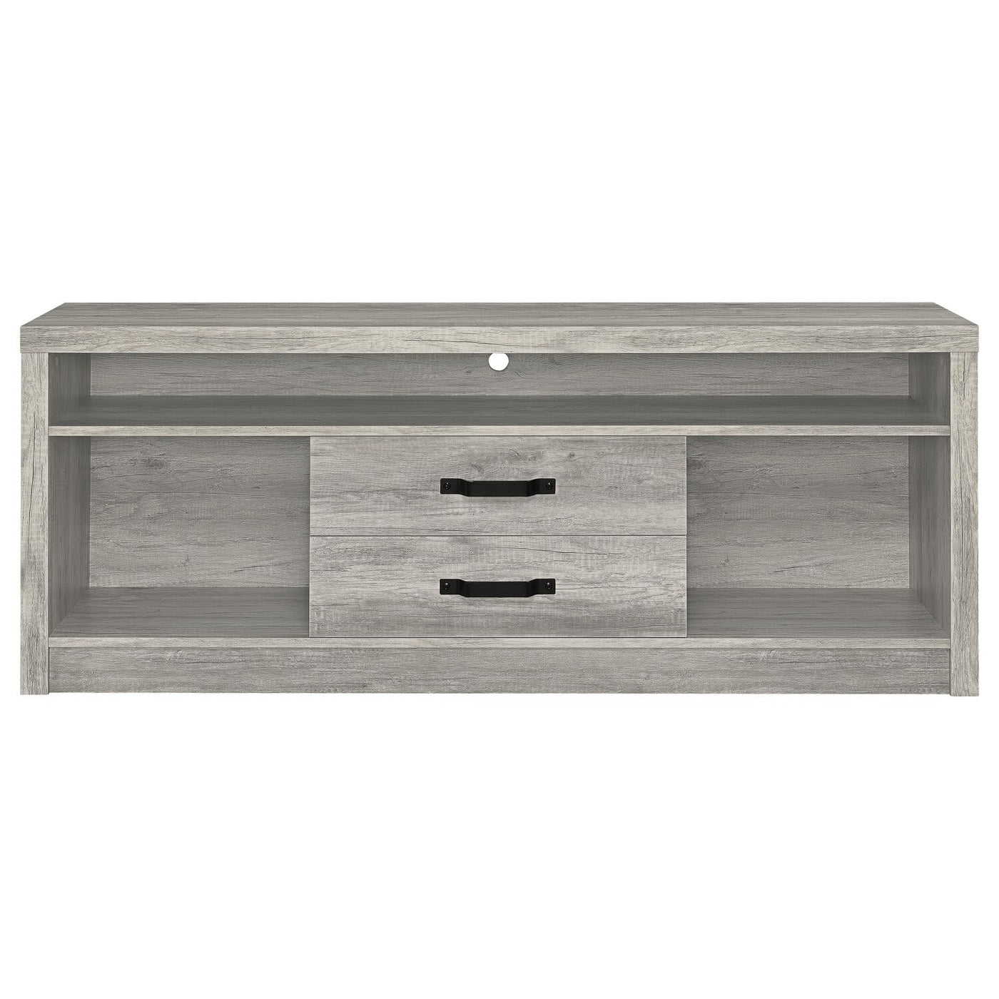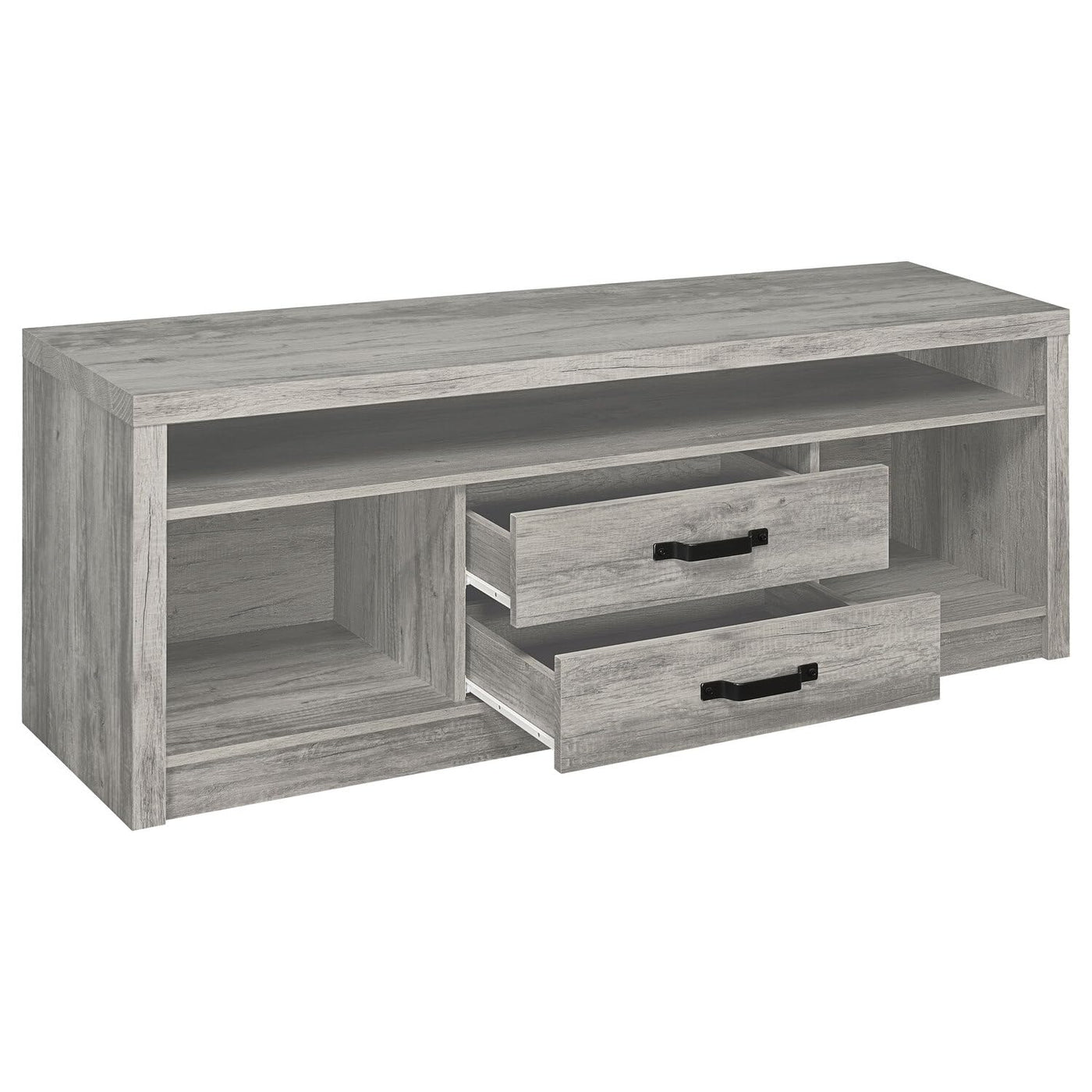 Fresh, airy styling invigorates a modern space. Keep an entertaining space contemporary and useful with this TV console. Linear design features a slender open top shelf, two open side cubbies, and a pair of slide-out drawers. Combine electronic devices, components, and media in one unit. A cool grey driftwood finish lightens any space.