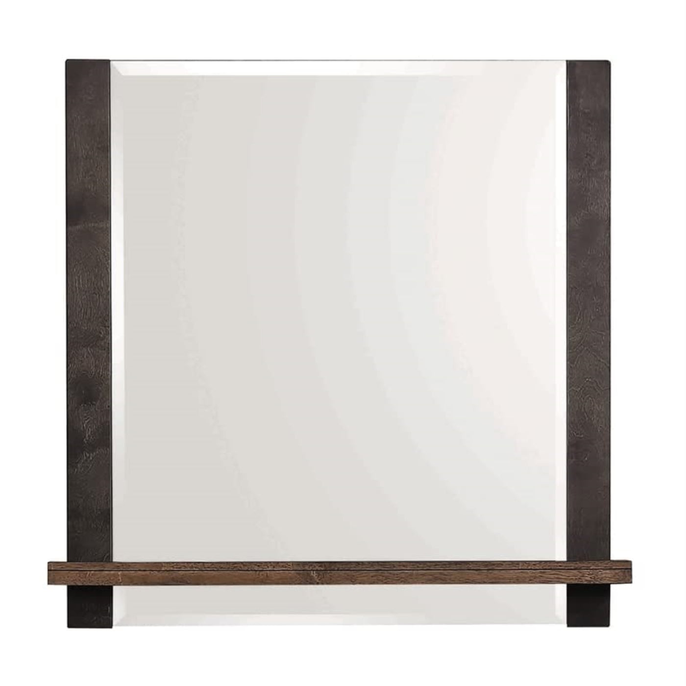 Visually charming as it is functional, this rectangular wood framed dresser mirror completes a design scheme in any space. A thick frame delivers definition and highlighting to add balance and proportion. Options for attaching to a variety of case pieces becomes a positive feature. A panel of beveled glass is framed in Asian hardwood, walnut veneer, and other wood products, with a bonus jewelry tray attached. Embrace a rich walnut finish frame that warms any space and contributes to flexibility for future bedroom redesigns.