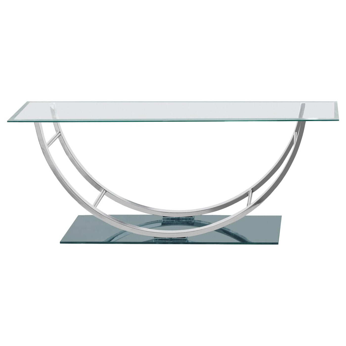 Coaster Glass Top coffee table in Chrome; features: Finish Color: Chrome reflective tempered "Half Glass" Base Specifications: overall product Dimensions: 18" H x 48" W x 24" D Product Weight: 66 lbs. . Finish Color: Chrome.