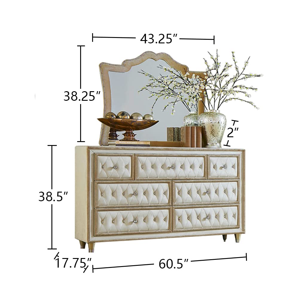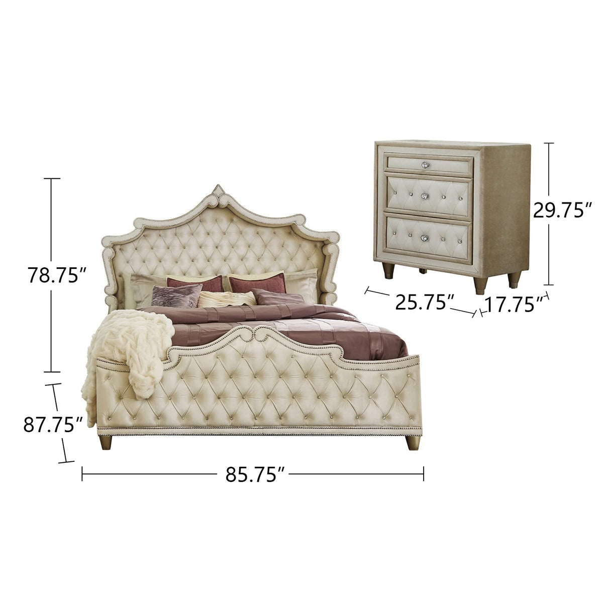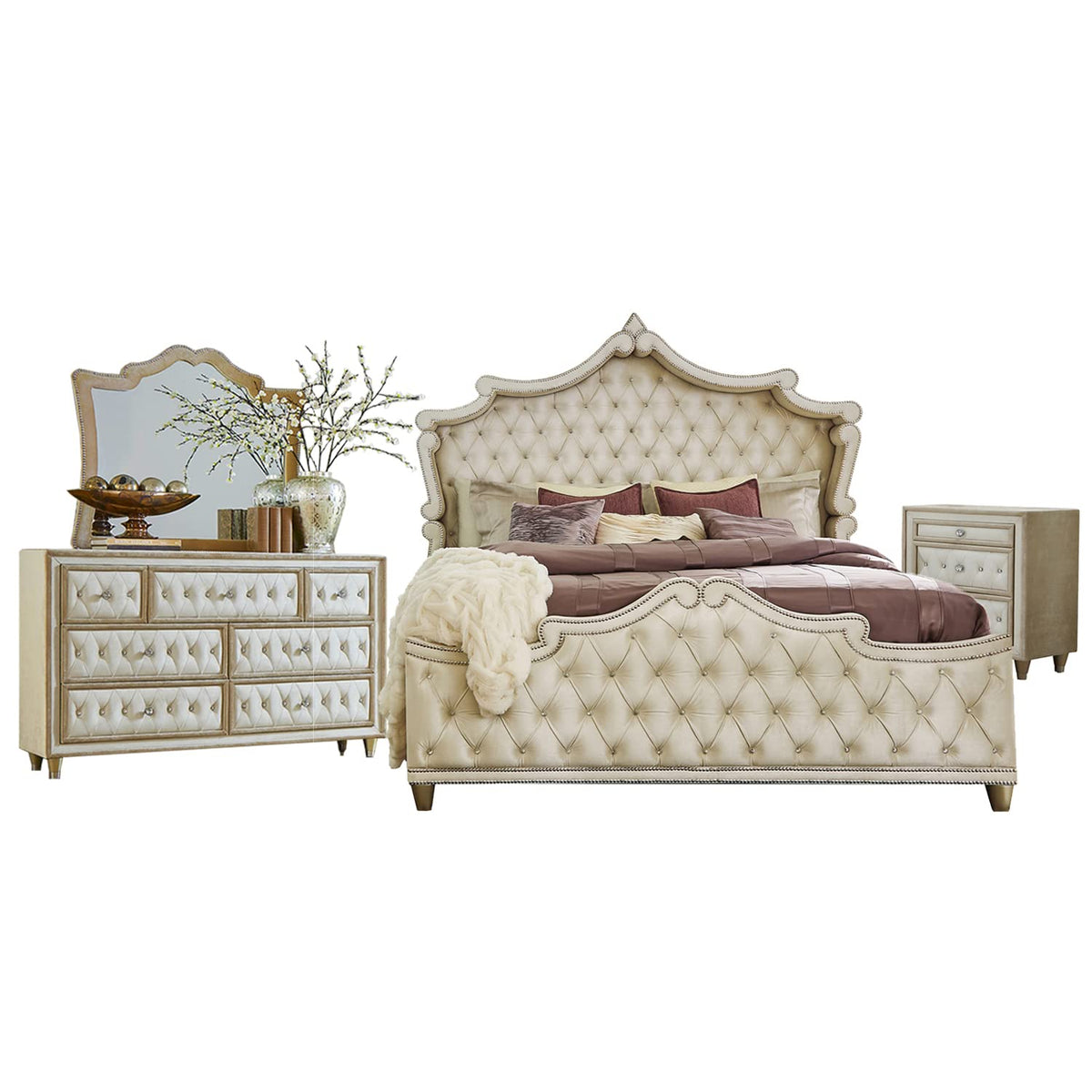 A traditional and modern bedroom set meets all expectations for an incredible impact in your sleeping space. Smooth and soft upholstered enhances each piece in this set. Coming in a camel and ivory color, this set is inspired by French Provincial decor. Crystal-like accents make their presence known within the button tufting. Gorgeous nailhead trim adds the finishing touch on this upholstered bedroom set.FeaturesInspired by classical French Provincial designs, reinvented with a modern point of view, this collection will make you feel like true royalty Extravagant statement bed, designed with wrap around shelter effect in the headboard Tone on tone upholstery effect using ivory and camel velvets to create depth and richness, along with sparkling tufted buttons and crystal hardware Nailhead trim and champagne metallic finished legs with metal caps detail contribute to the perfect rhythm of an opulent life Coaster's exclusive designDimensions:Eastern King Bed Assembled Product: 85.75 inches wide x 87.75 inches deep x 79.25 inches high Weight Capacity: 600 poundsNightstand Assembled Product: 25.75 inches wide x 17.75 inches deep x 29.75 inches highDresser Assembled Product: 60.5 inches wide x 17.75 inches deep x 38.5 inches highDresser Mirror Assembled Product: 43.25 inches wide x 2 inches deep x 38.25 inches highAt Coaster, we are your premier source for exquisite furniture, offering diverse styles to enhance every aspect of your life. Our passion for excellence drives us to innovate, crafting budget-friendly furniture that complements your lifestyle. Explore our brands for endless design inspiration and make your living experience exceptional with thoughtfully designed, affordable pieces that inspire a life well-lived.
