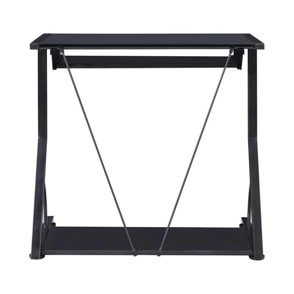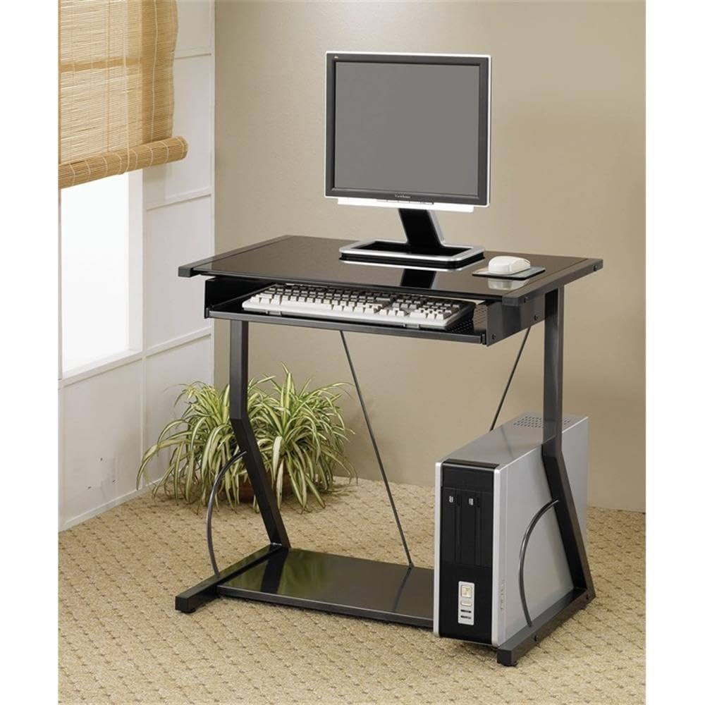 Sleek lines and sensible functionality combine to create the perfect computer desk for a contemporary office. Its striking design features a modern profile with a black tempered glass top. A convenient keyboard tray keeps your keyboard tucked away. A bold black powder coated finish with chrome accents tie it all together. Constructed from steel, MDF, and other durable materials, it's is as strong as it is stylish.