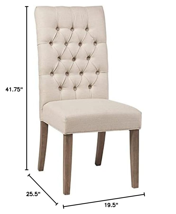 This set of two wood and fabric tufted parson chairs has a handsome rustic design. Each chair is crafted with durable Asian hardwood and plywood. Stylish elements shine through in the sand-colored linen-like fabric upholstery and tufted seat back. A warm vineyard oak finish completes the look of this charming set. You'll love the versatility that makes these chairs well suited for both everyday or formal dining.