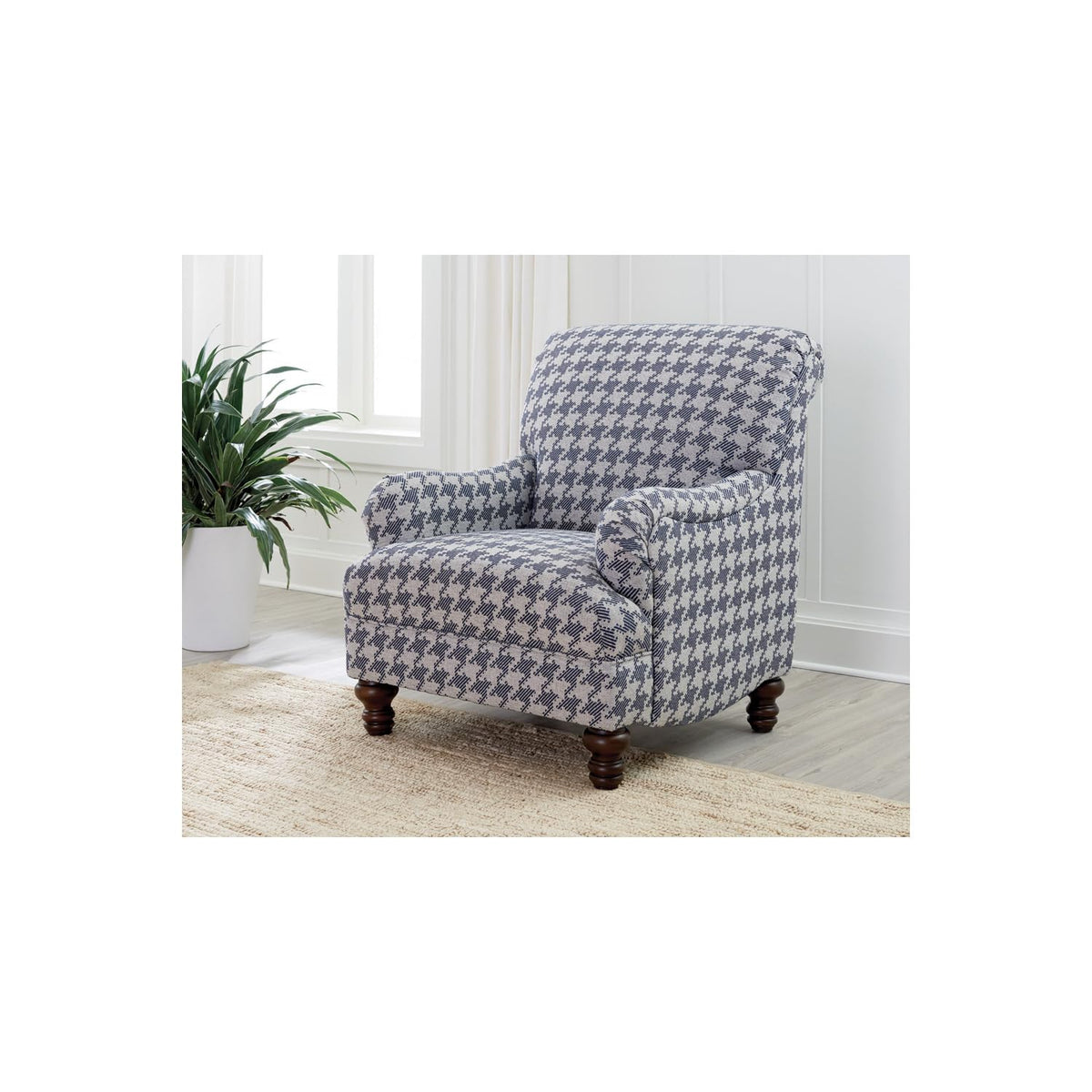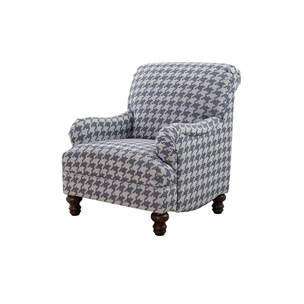 A standout houndstooth check pattern draws due attention to this fashionable accent chair. With tailored English arms and turned legs offering a contrasting espresso finish, this chair impresses with a blue and light grey upholstered cover. A solid wood frame with a sinuous spring deck sets the stage for durability. Attached seat and back cushions remain stationary to prevent shifting. Offer upbeat personality and a whimsical touch to a modern space with soft elements in this enticing chair.