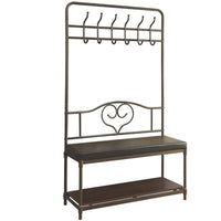A lovely design concept offers style and function in a traditional space. Make an entryway more efficient with this hall tree. Crafted from metal in a dark bronze finish, it complements virtually any palette. Six double hooks accommodate scarves, coats, and hats, and a lower shelf makes room for shoes. An upholstered bench is built in to provide temporary seating.