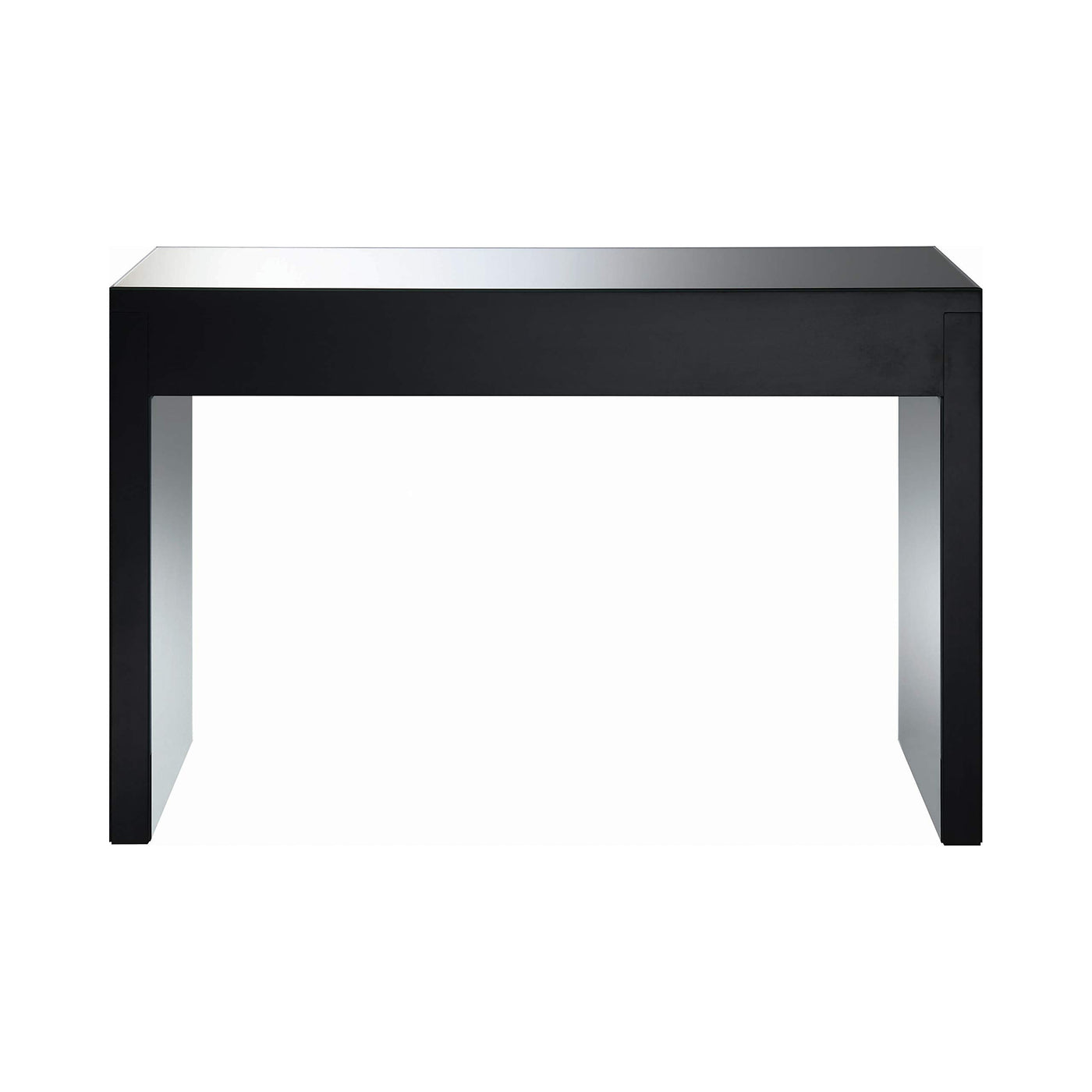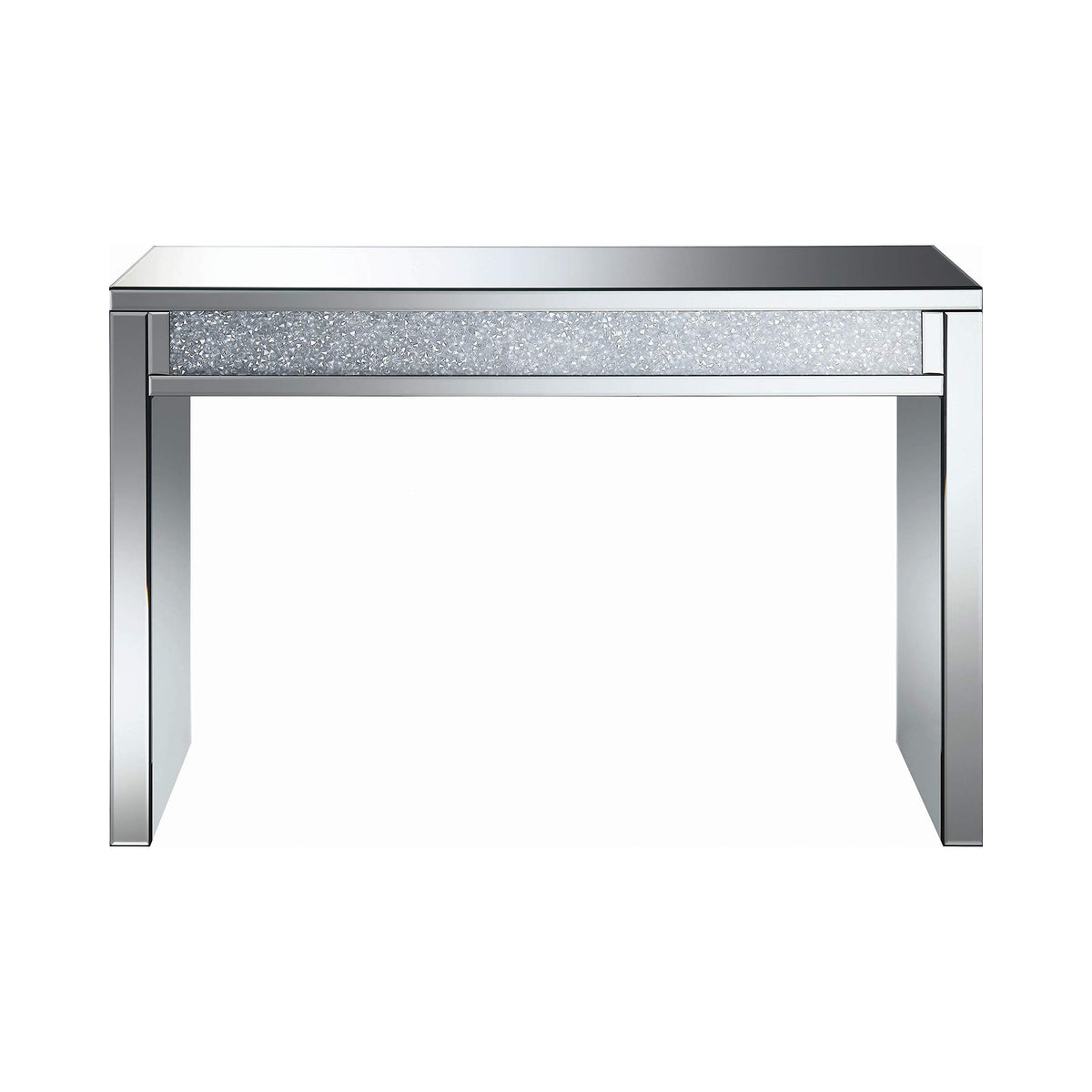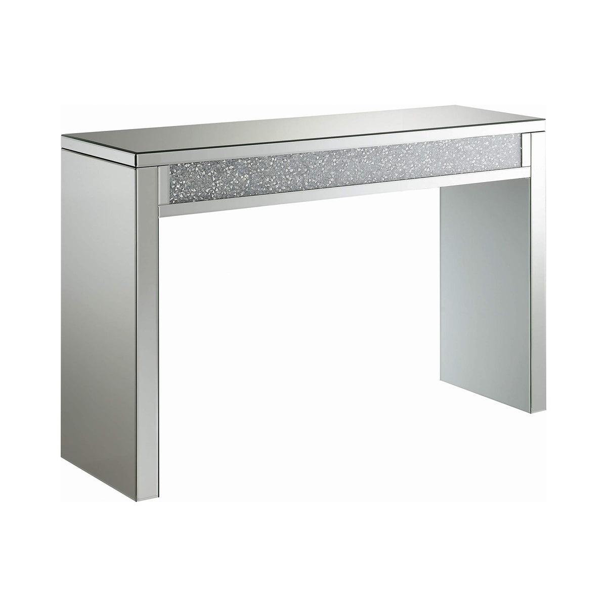 A sofa table is an accent piece that looks good anywhere. This silver sofa table matches well with a modern, contemporary styled sofa finished in black or light grey. It also looks great as a standalone piece topped by a silver-accented lamp or decorative vase. Straight lines offer a fresh, modern appearance. Sides are finished in a unique pattern that is nice contrast to solid silver finish throughout.